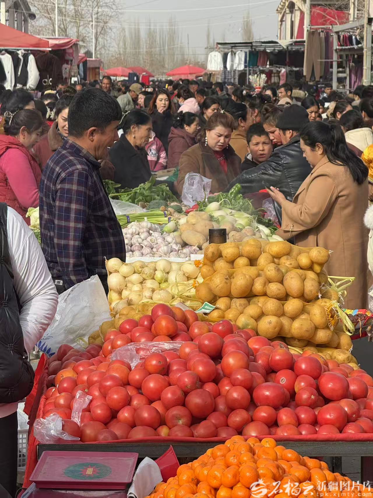 2月10日,皮山县木吉镇巴扎果蔬区熙熙攘攘的人群。天山网-新疆日报记者 拍热扎提·阿不都 摄