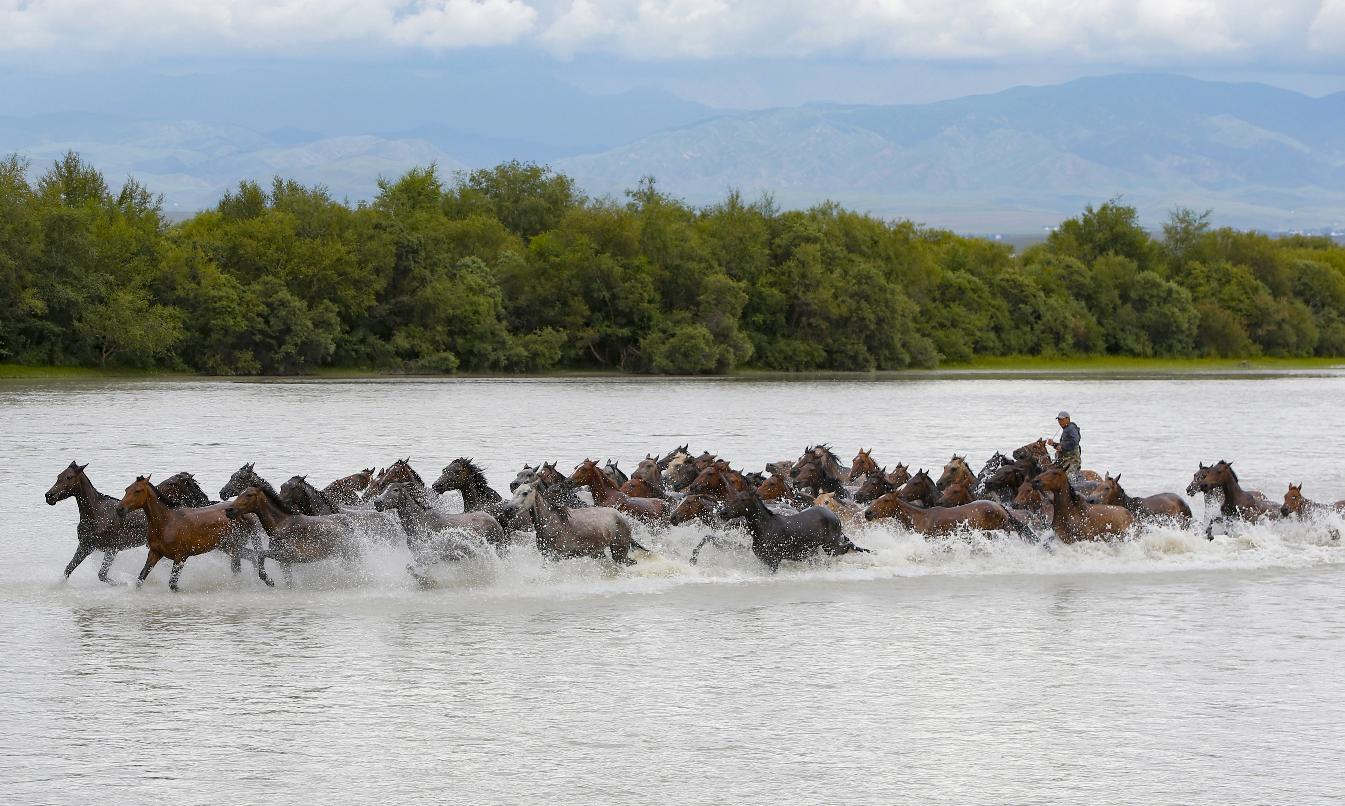 这是2025年7月19日在新疆昭苏县举办的2025新疆伊犁天马文化旅游节开幕式上的万马奔腾场景。新华社发(张利民 摄)