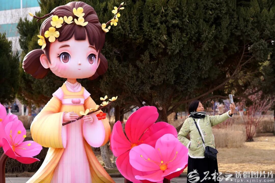 哈密市街头,市民在花灯前拍照打卡。曹新加 摄