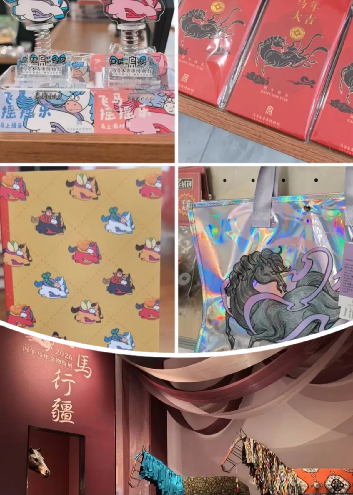 与此同时,乌鲁木齐市博物馆的“飞马行疆——丙午马年文物特展”同样人气高涨。“飞马流云纹砖”是乌鲁木齐市博物馆的镇馆之宝,以此为灵感,乌鲁木齐市博物馆推出了马年红包、笔记本等一系列文创产品。