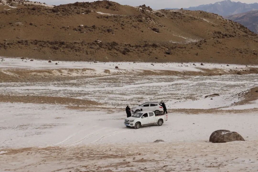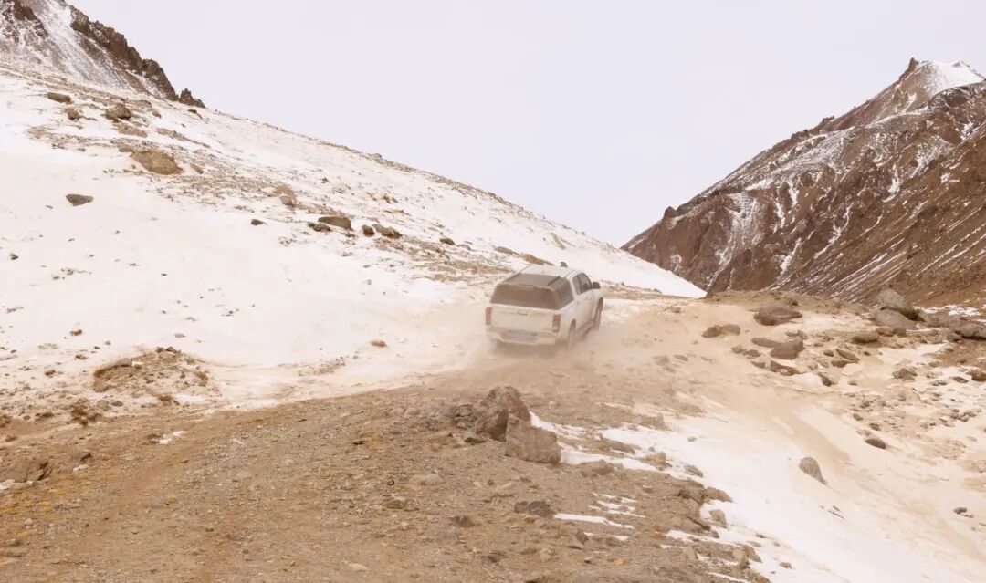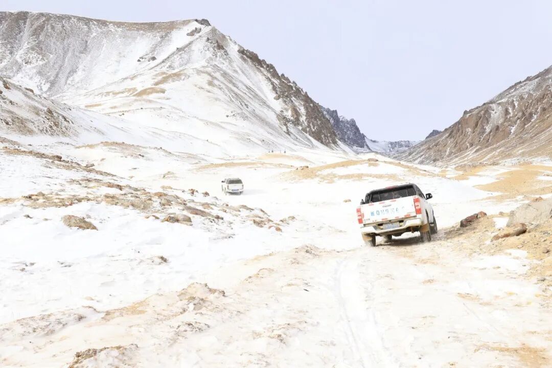 图片说明:越野车一前一后,穿过几处积雪路段,海拔4100米的塔提库里人工影响天气烟炉作业点已经出现在眼前!