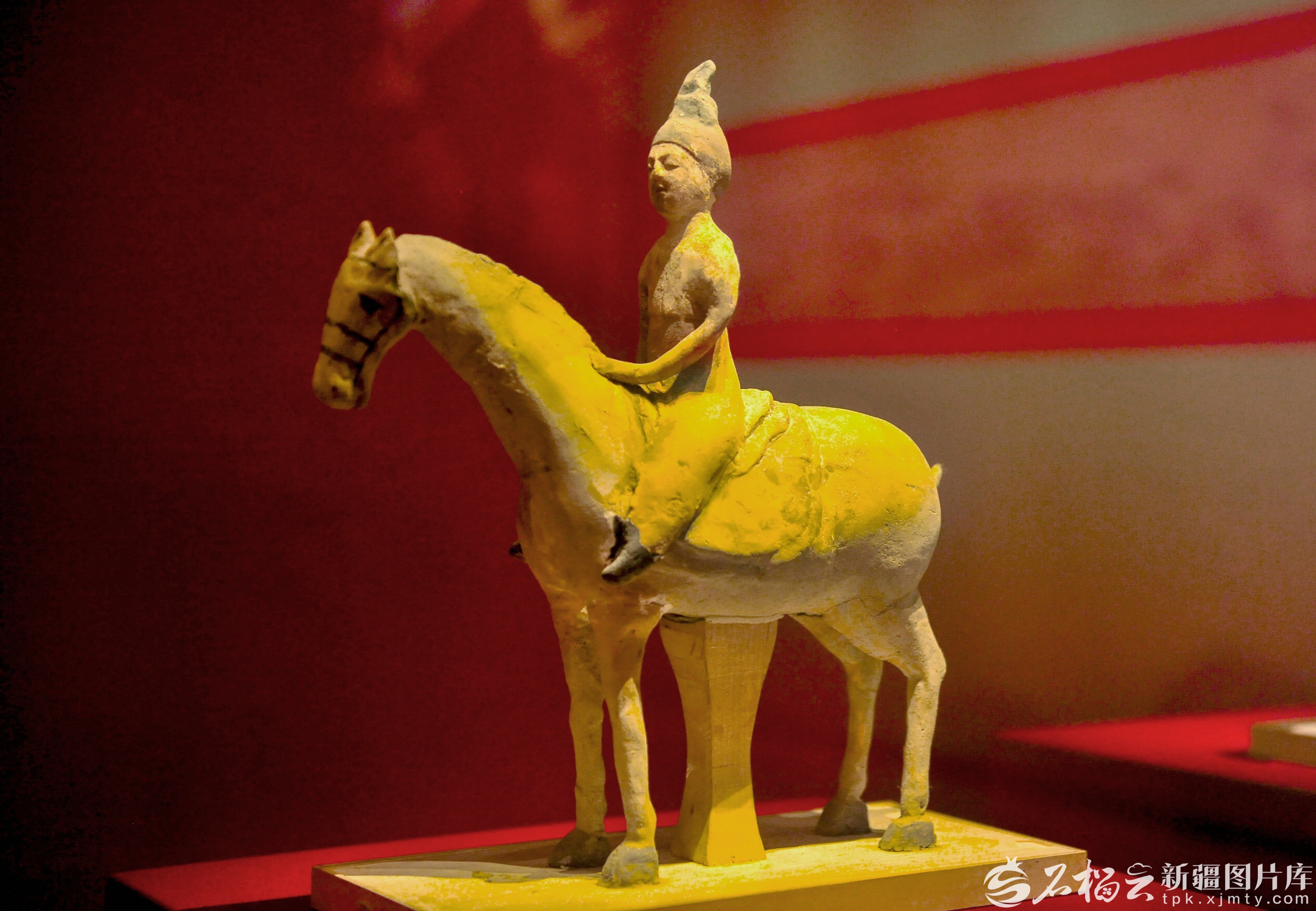 唐代彩绘泥塑马舞俑(又称彩绘泥塑骑马舞俑),出土于吐鲁番市阿斯塔那墓葬,现藏于新疆博物馆。
