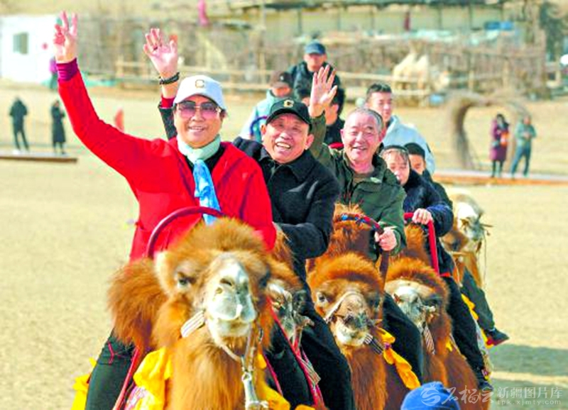 2月19日,游客在尉犁县罗布人村寨景区体验骑骆驼,感受大漠风光。 汪志鹏摄
