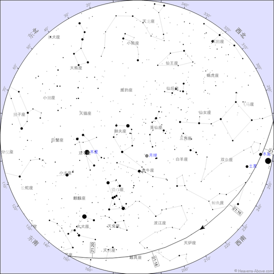 今日21点14分43秒到21点18分57秒之间,如果你在喀什,又逢天空晴朗少云,那么不妨在这个时段仰望夜空,静等几分钟,就会看见天宫空间站(中国空间站)在夜空中移动,其最亮在21点16分,位置为夜空西南方。