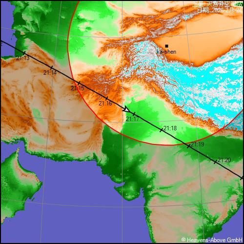 喀什地区今晚(2月24日)预报的星下点轨迹图,高亮的圆形区域标明了卫星的地平高度至少为10度的范围。此圆形区域的大小取决于卫星的高度。粗略的讲,理论上高亮的圆形区都可以观赏到该卫星。