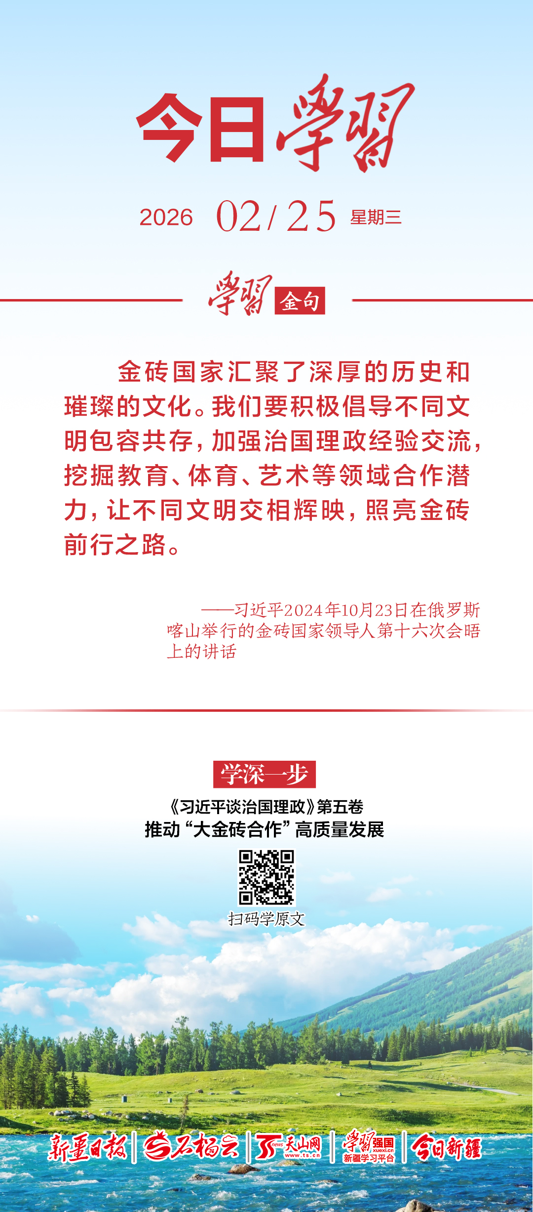 金砖国家汇聚了深厚的历史和璀璨的文化。我们要积极倡导不同文明包容共存,加强治国理政经验交流,挖掘教育、体育、艺术等领域合作潜力,让不同文明交相辉映,照亮金砖前行之路。