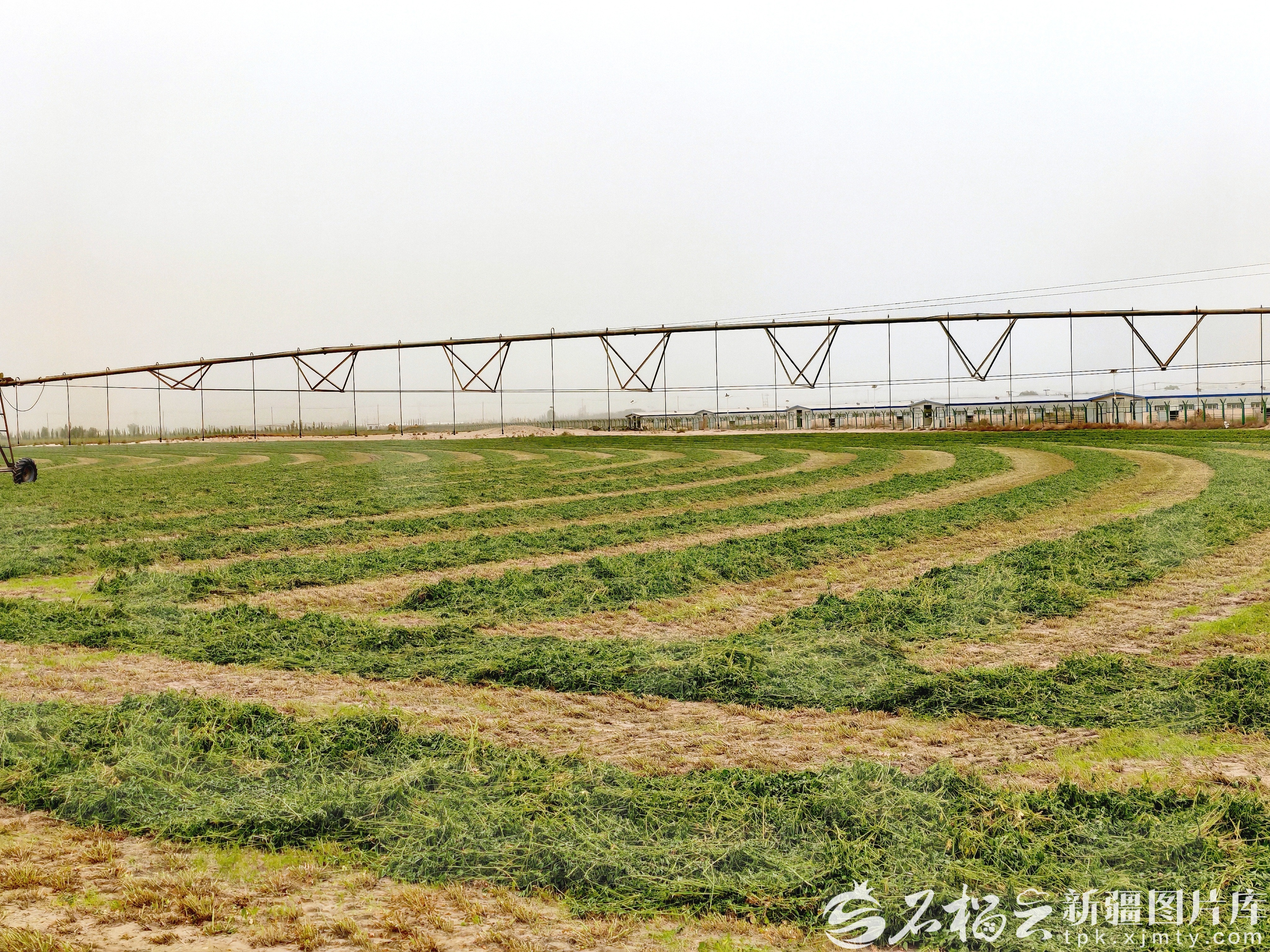 在和田县千亩苜蓿示范基地,指针式喷灌机灌溉让戈壁上长出优质饲草。张树振摄