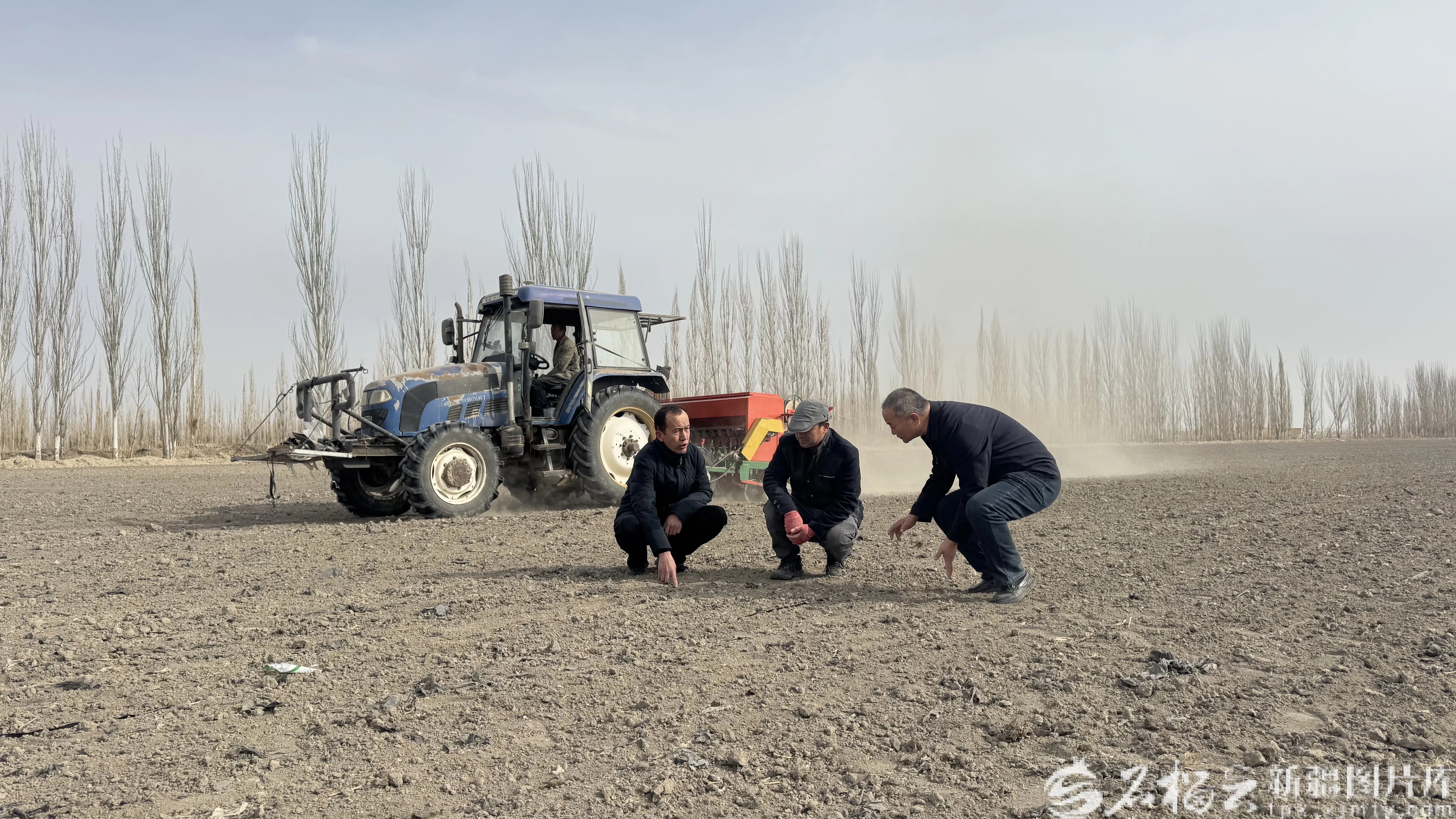 2月26日,在和硕县的新疆清源农业发展有限公司高标准农田里,种植户在探讨采用新技术播种。麦尔当·黑尼 摄