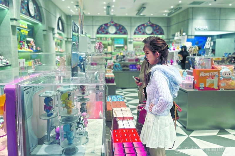 2月26日,在乌鲁木齐CCMALL时代广场泡泡玛特门店,年轻顾客在挑选潮品。