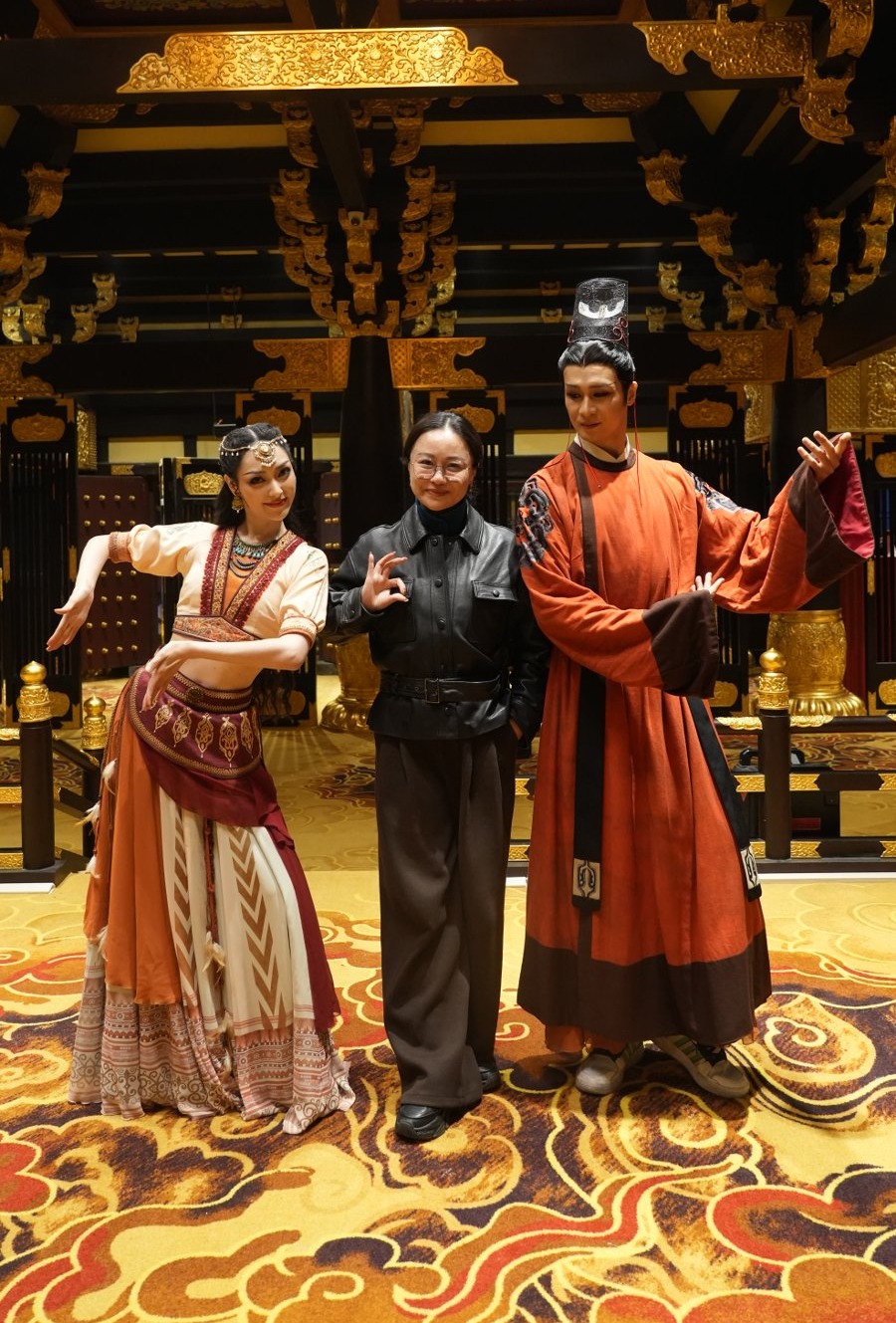 《和鸣之美》中主演冯世扬(右)以全新造型亮相,他在舞剧《龟兹》扮演男主角罗什,图为他与主演李淼(左)、编导佟睿睿(中)合影。《和鸣之美》剧组提供