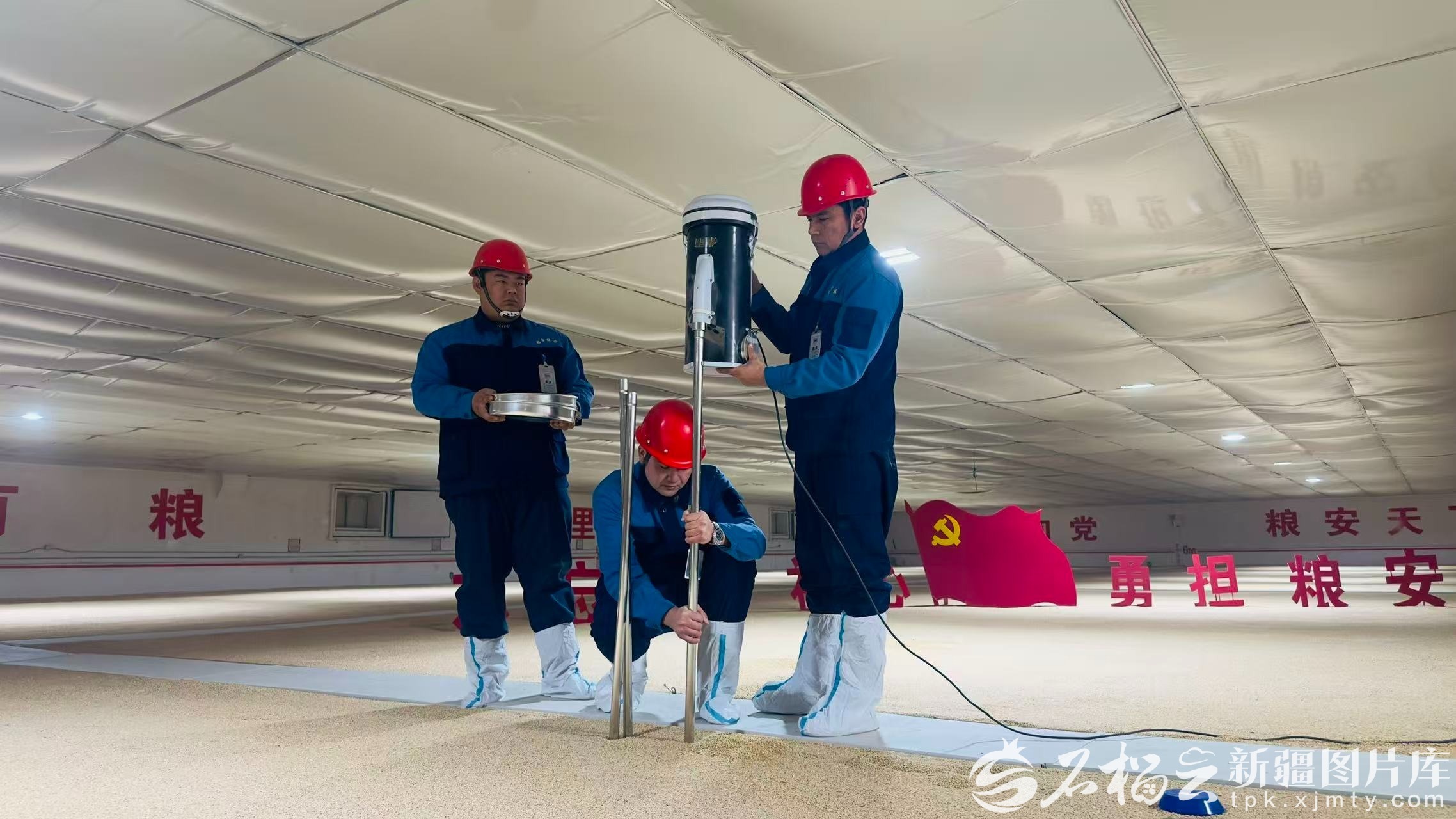 2025年12月初,新疆佳麦乐客粮食储备有限责任公司技术人员检查储备粮粮情。图/新疆佳麦乐客粮食储备有限责任公司提供