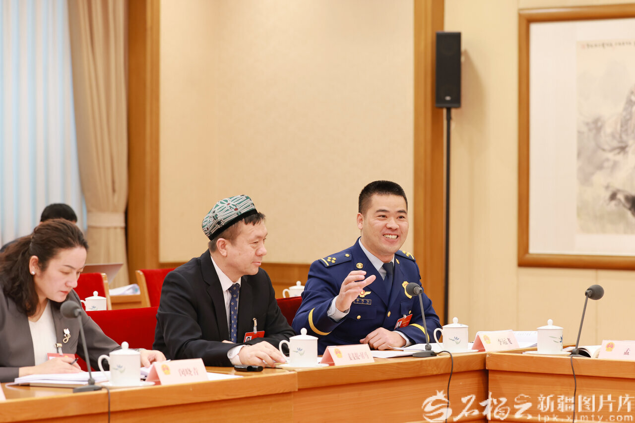 图为李运飞代表(右一)在发言时提出加大对老旧高层民用建筑内公共消防设施维护管理和迭代更新的资金支持力度的建议。天山网-新疆日报记者 崔志坚摄