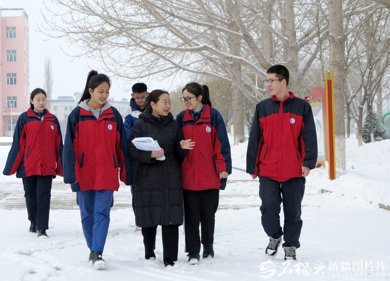 住疆全国政协委员关芳芳(中)与察布查尔锡伯自治县高级中学高三学生交谈。石榴云/新疆日报记者邹懿摄