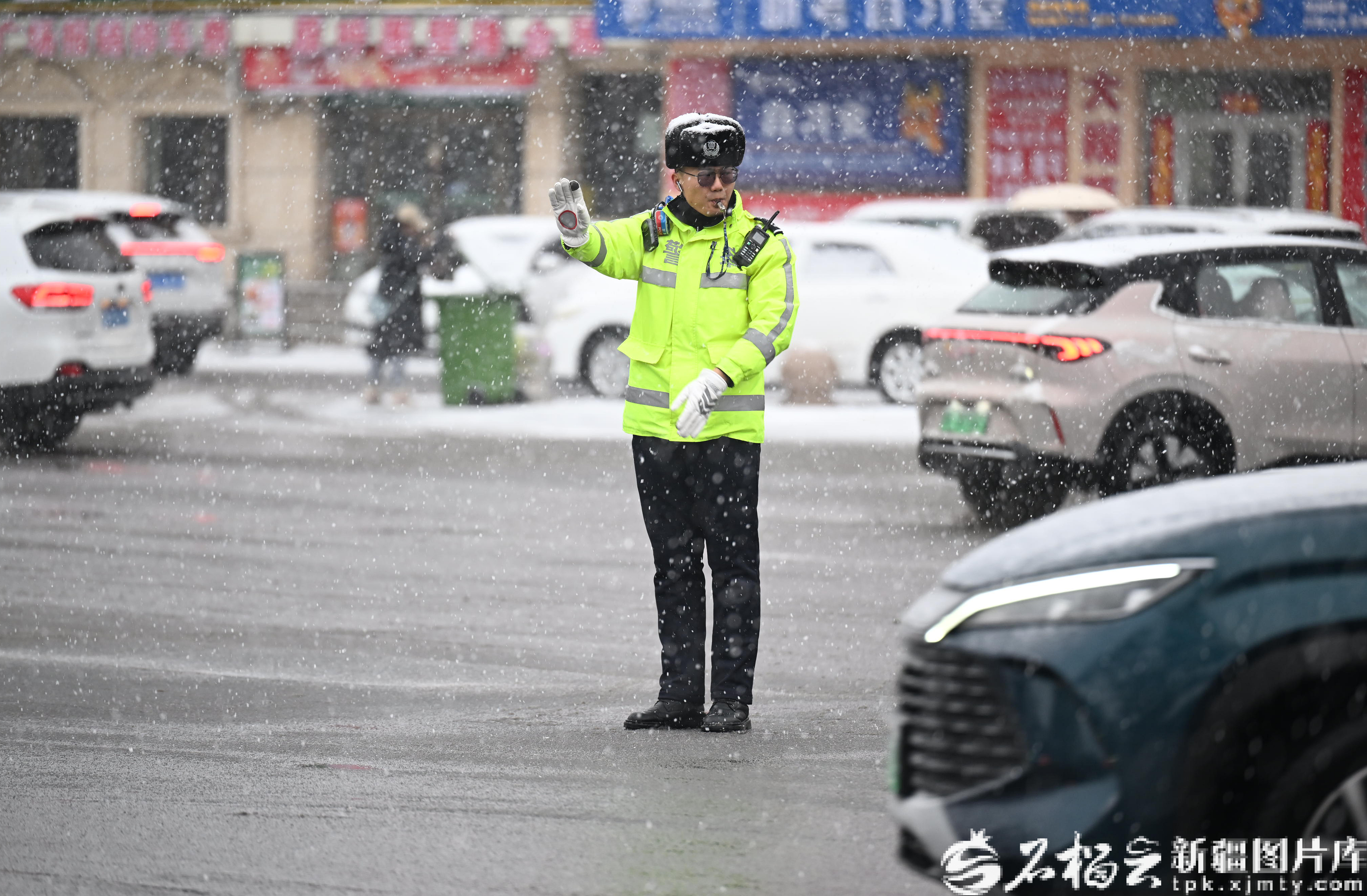 3月11日,昌吉市,一名交警在十字路口指挥交通。何龙摄
