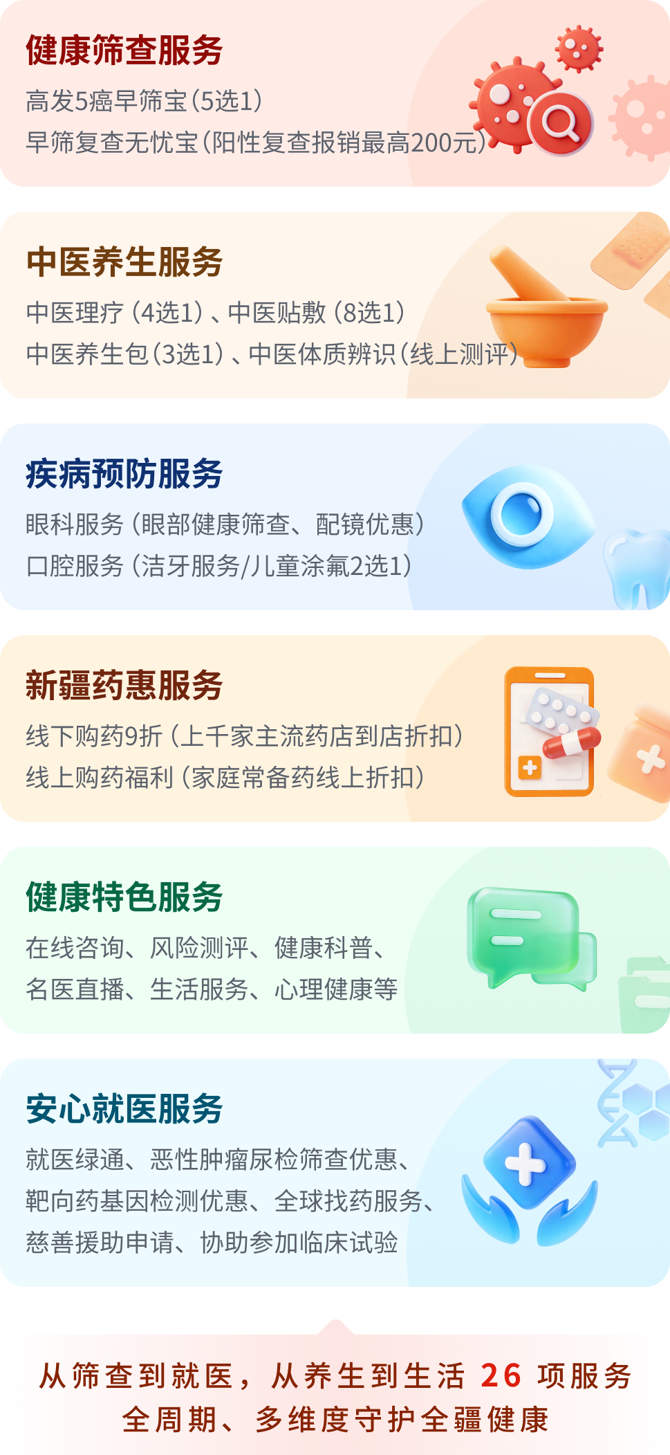 除了核心医疗保障,“新疆福康保”还为参保人提供全方位免费健康服务,涵盖健康筛查、中医养生、疾病预防、新疆药惠、健康特色、安心就医等六大类26项服务,推动保障模式从“事后理赔”向“全流程健康守护”转变。