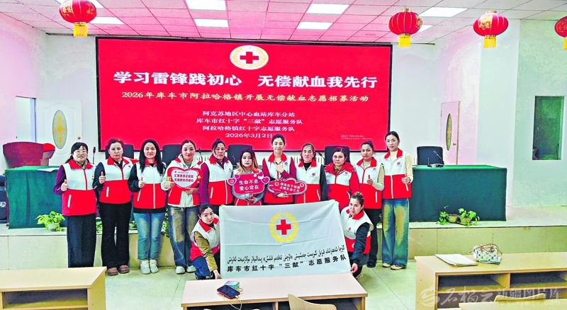 近日,库车市阿拉哈格镇开展无偿献血志愿招募活动。图为无偿献血志愿者在活动中合影留念。丁长琴摄