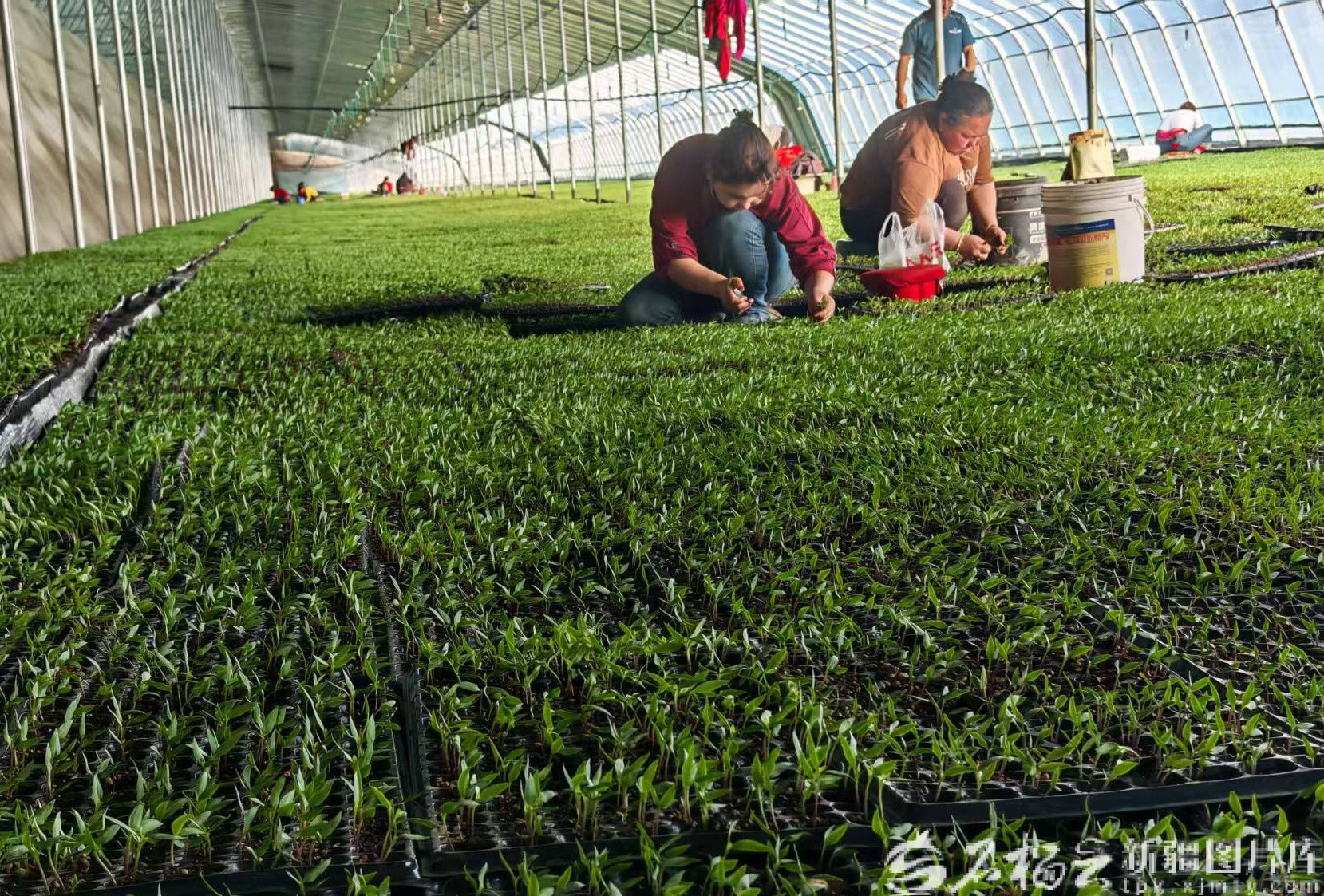 3月9日,在焉耆回族自治县北大渠乡北渠村番茄育苗基地的温室大棚里,工人正在间苗。马热古丽·麦海木 摄