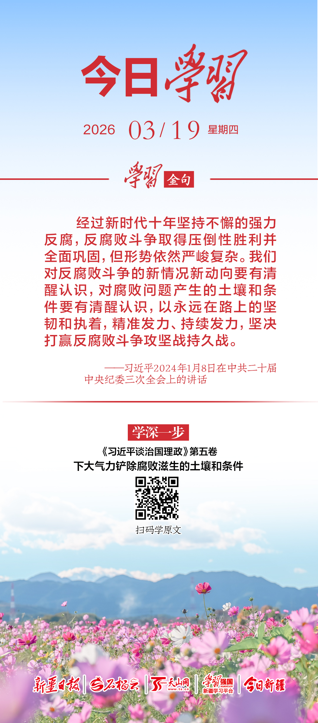 经过新时代十年坚持不懈的强力反腐,反腐败斗争取得压倒性胜利并全面巩固,但形势依然严峻复杂。我们对反腐败斗争的新情况新动向要有清醒认识,对腐败问题产生的土壤和条件要有清醒认识,以永远在路上的坚韧和执着,精准发力、持续发力,坚决打赢反腐败斗争攻坚战持久战。