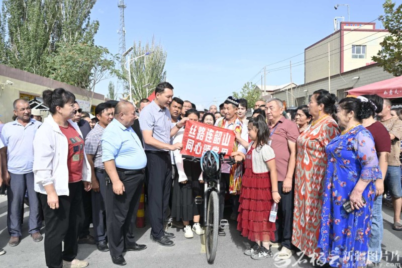 2025年8月2日,乡亲们为即将骑车奔赴湖南省韶山市的阿力甫·买买提送行。贾吉雨 摄