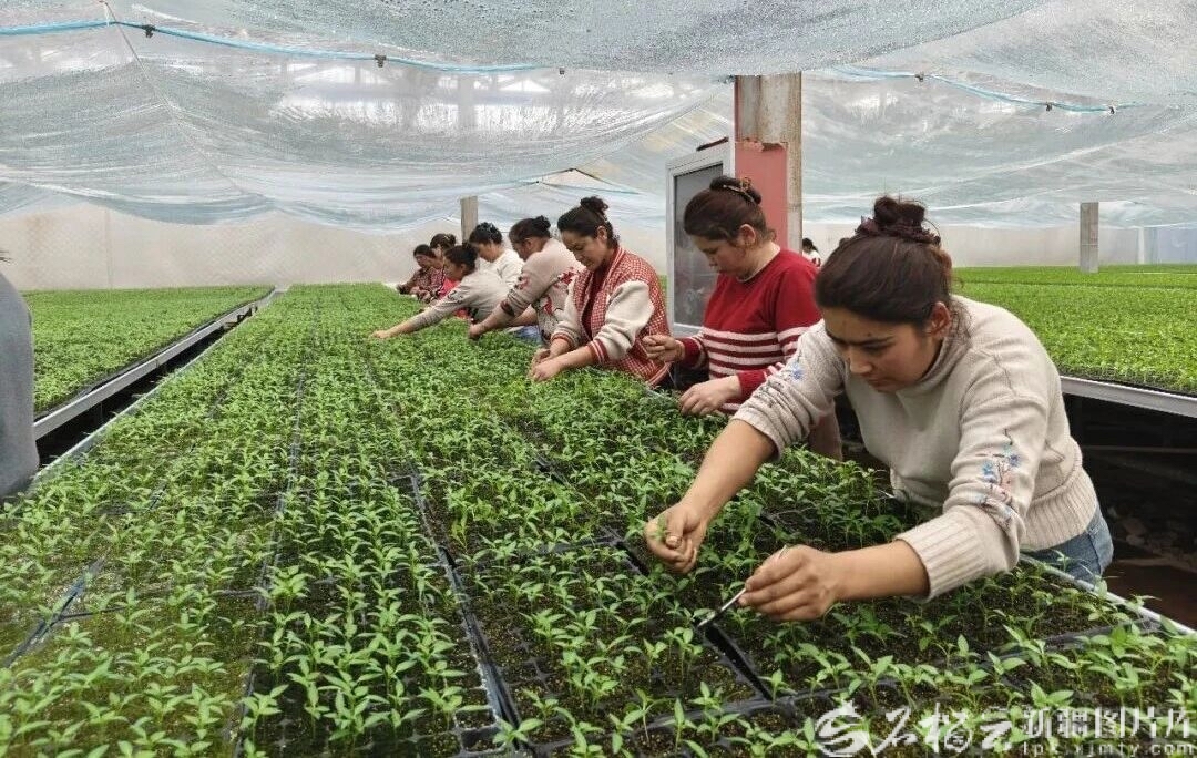 疏附县育苗中心内,工人们在进行分苗、补苗等操作,棚内培育的330多万株“春提早”蔬菜苗可全面满足全县春耕种苗需求。图/疏附县融媒体中心提供