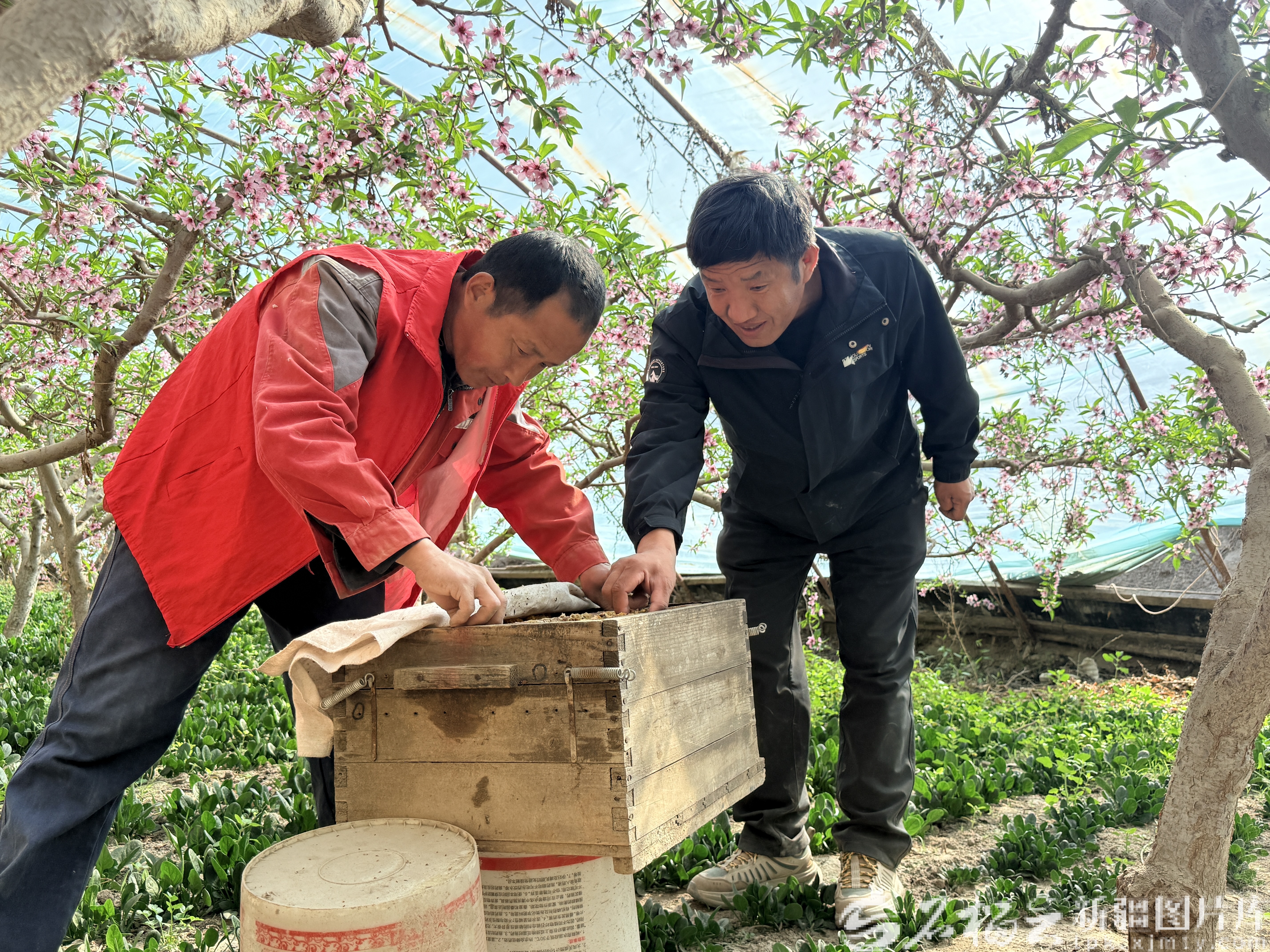 3月2日,在泽普县波斯喀木乡阿热恰喀村的大棚内,技术员与党员志愿者查看蜜蜂授粉及生长情况。黄代辉摄