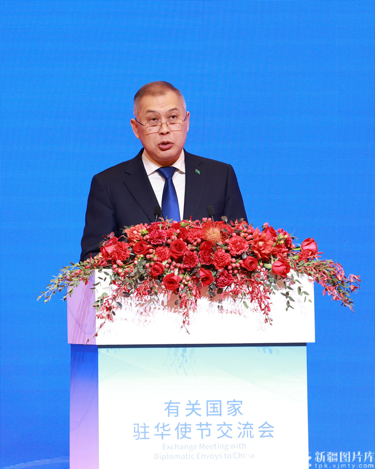 哈萨克斯坦驻华大使沙赫拉特·努雷舍夫作交流发言。石榴云/新疆日报记者 崔志坚摄