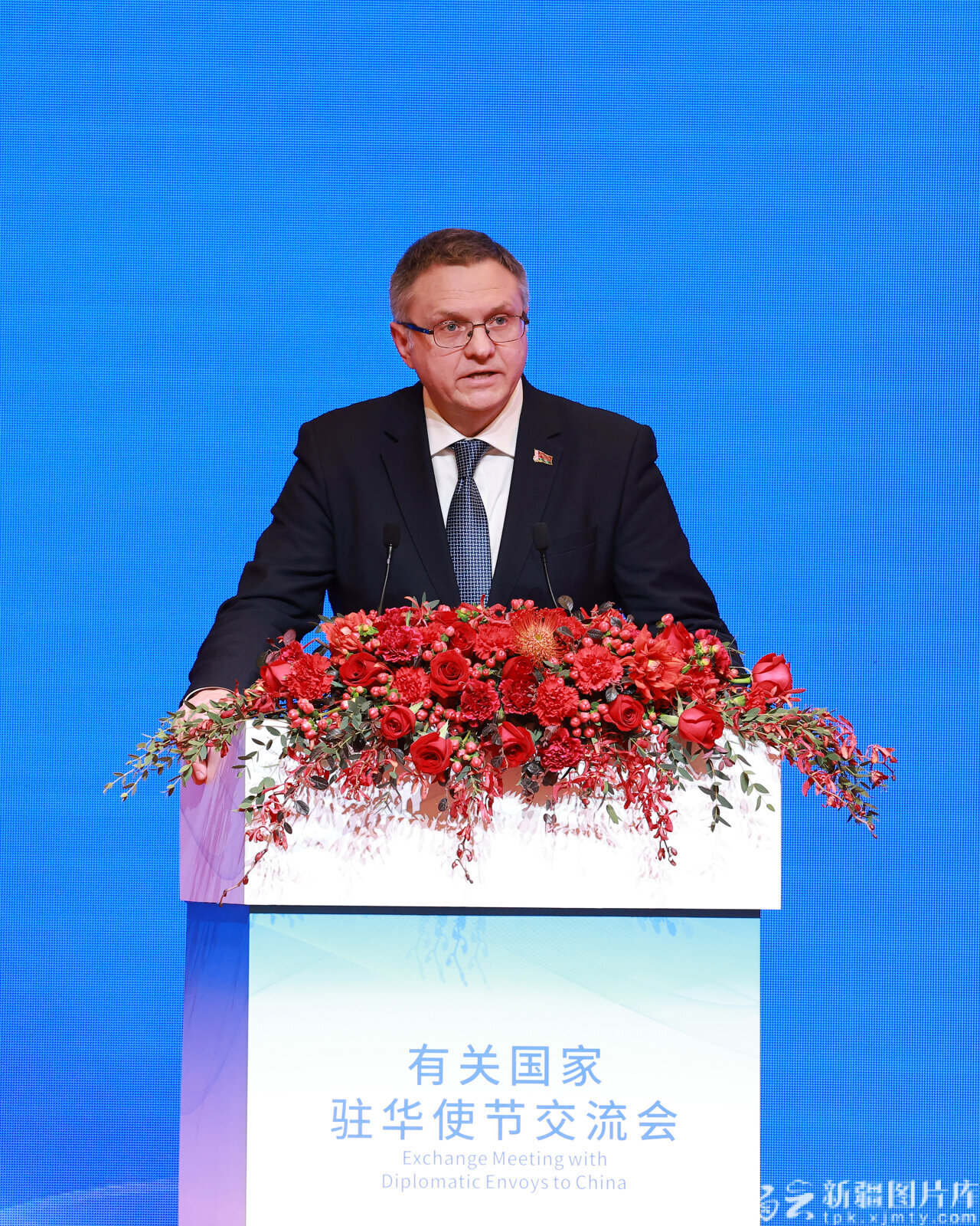白俄罗斯驻华大使切尔维亚科夫·亚历山大作交流发言。石榴云/新疆日报记者 崔志坚摄