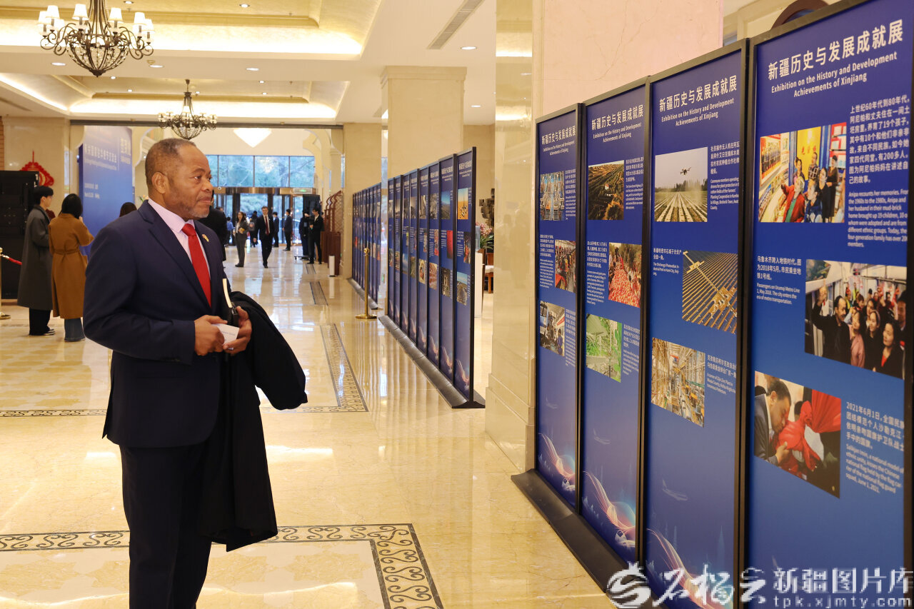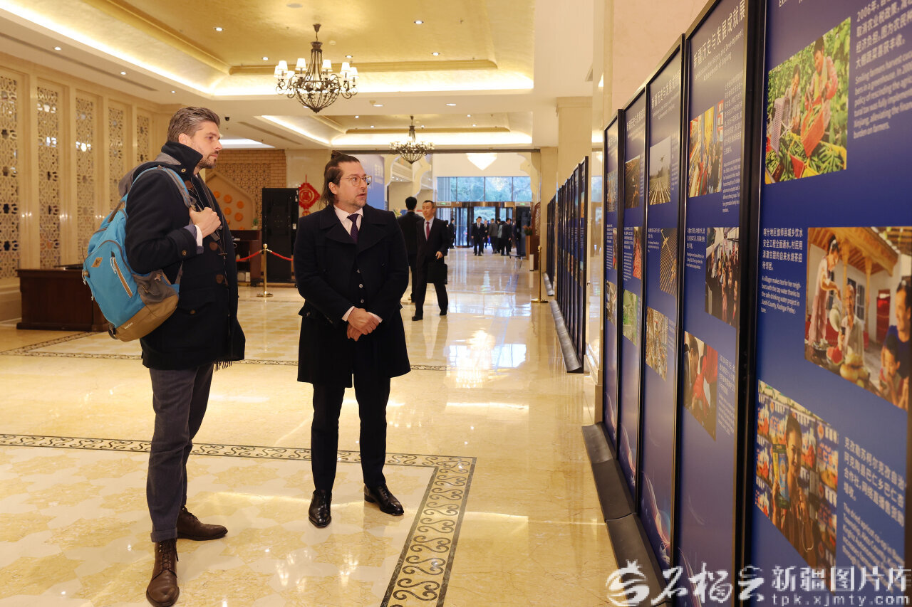 3月20日,有关国家驻华使节交流会前,嘉宾参观新疆历史与发展成就展。石榴云/新疆日报记者 崔志坚摄