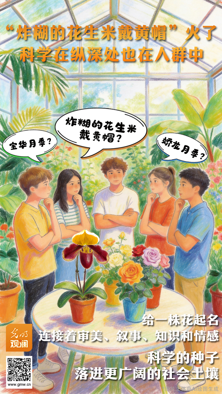 科学的发展,离不开纵向的不断精进,但与此同时,“炸糊的花生米戴黄帽”获高赞一事也告诉我们,科学还需要横向的广泛传播,公众看得见、听得懂、愿意靠近,科学的种子才会落进更广阔的社会土壤。这类破圈,让人感受到科学并不总是板着脸的,也不总是高悬的。给一株花起名,里面连接着审美、叙事、知识和情感,公众在参与中获得一点成就感,科研工作者在回应中看见社会反馈,平台在传播中放大正向兴趣,这样的循环一旦形成,科学传播就不再是单向灌输,而会慢慢长出持续性。