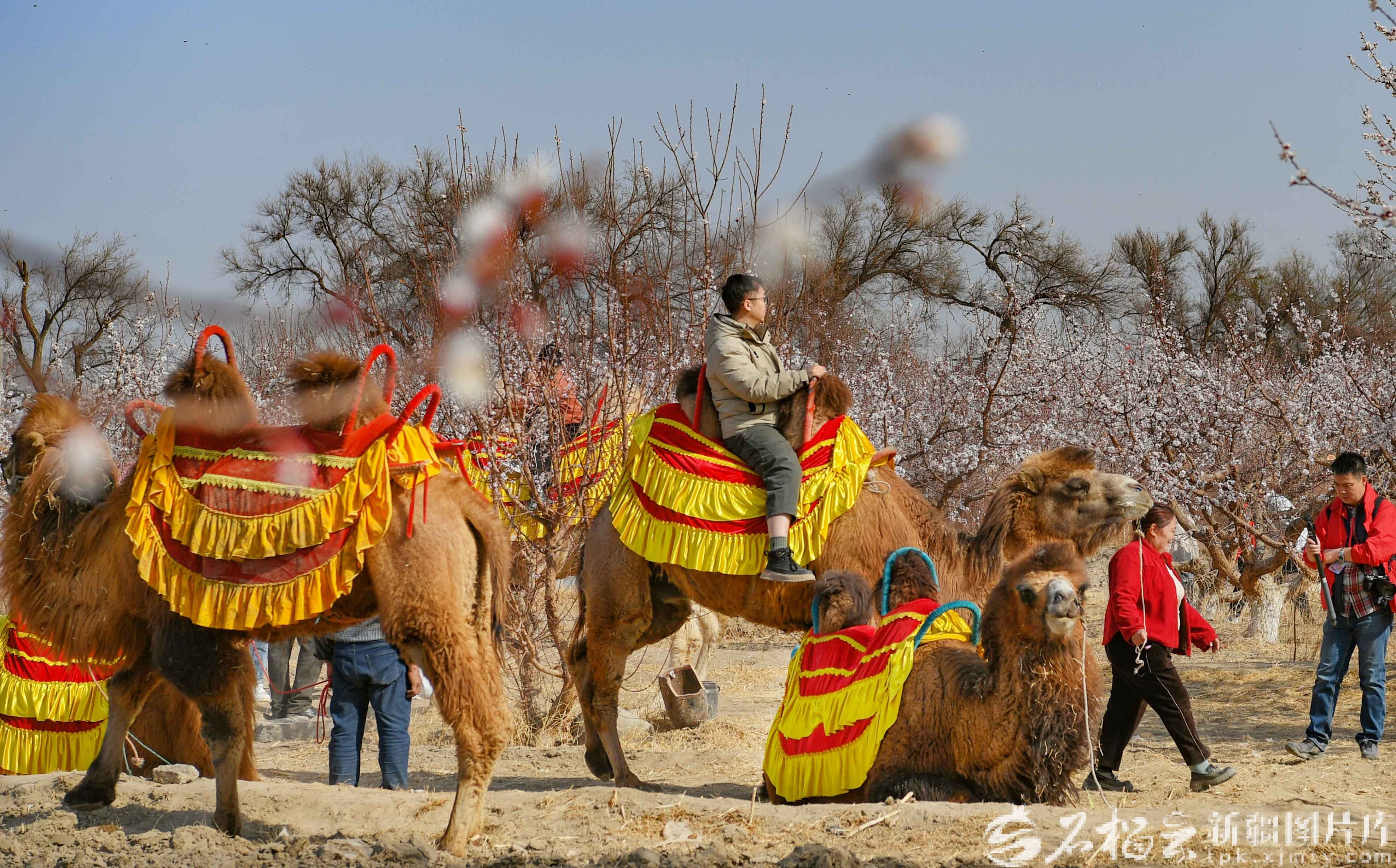 3月20日,游客在托克逊县夏镇南湖村杏花园体验骑骆驼。