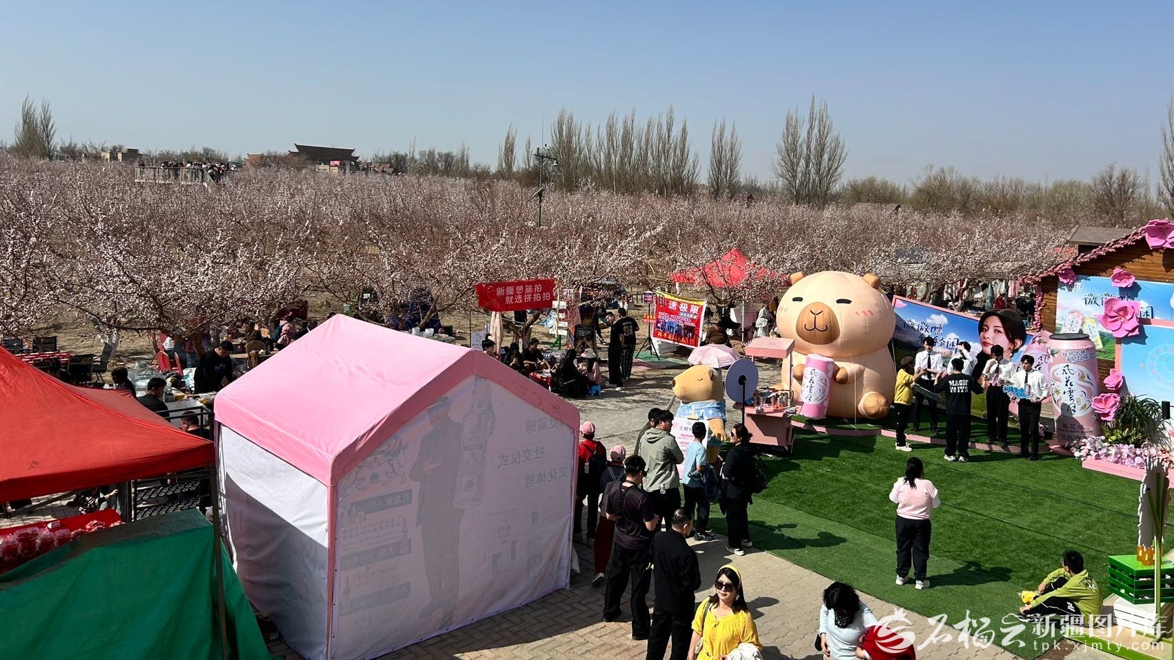 站在杏花观景木栈道上放眼望去,成片杏花如云似雪,连绵成片。而花海之外,更有“人海”涌动——当日,托克逊县接待游客26.2万余人次,旅游大巴200余辆、小型自驾轿车8.1万余辆,县域宾馆几乎满房。