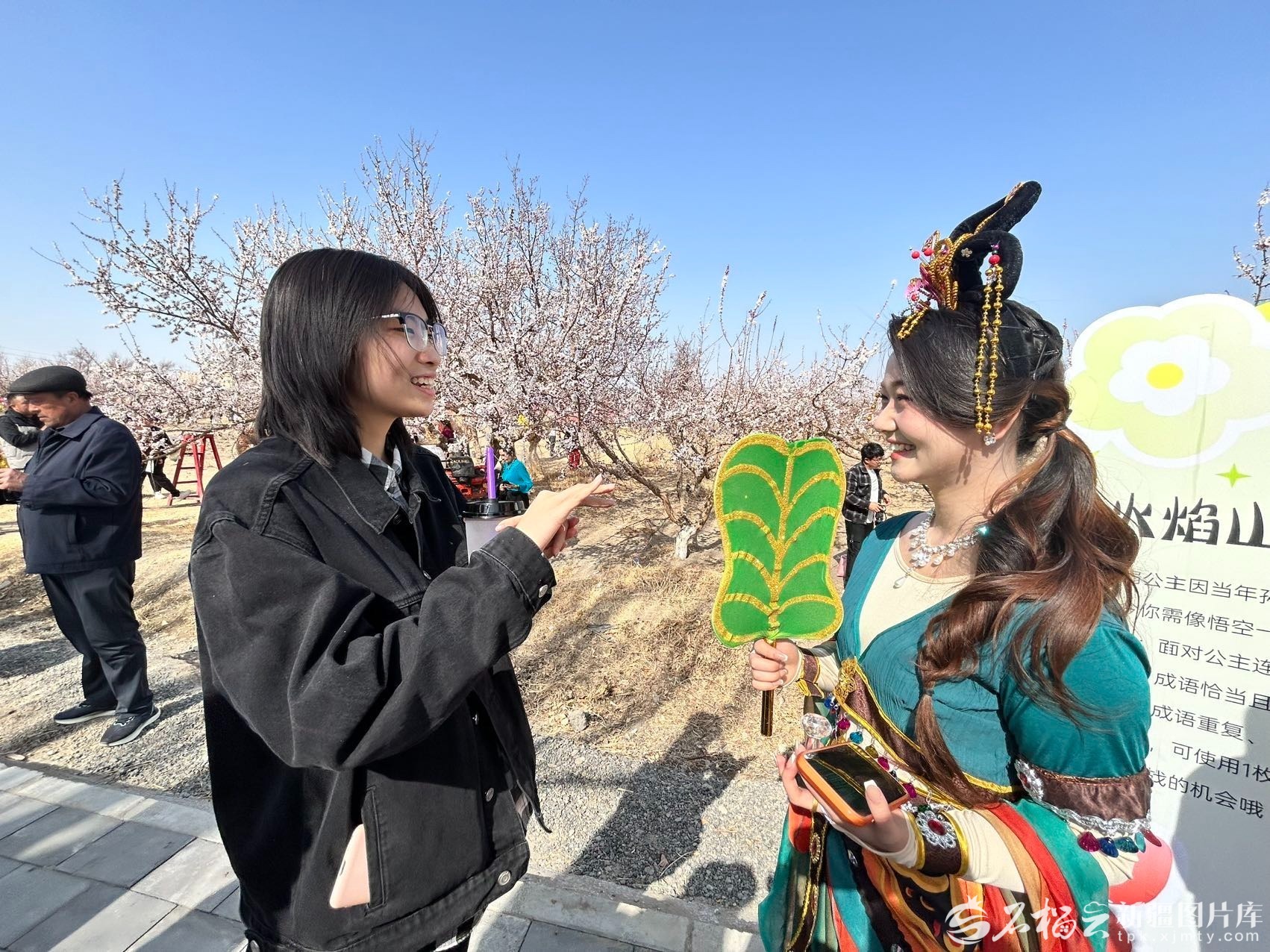 当天,128名志愿者化身四大名著人物、诗人、杏花仙子等NPC,与游客对诗猜谜、斗歌斗舞,盖章送“银票”。来自乌鲁木齐市的大二学生夏年佳一边赏花,一边和“孙悟空”猜谜,用成语夸“铁扇公主”,她笑着说:“本来只想看花,没想到这么好玩。”
