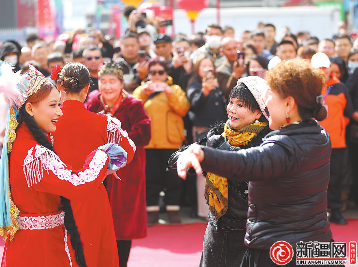 3月21日,在疆来城,游客与演员一起跳起欢快舞蹈共度肉孜节。(记者石磊摄)