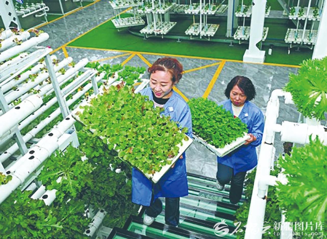 3月1日,昌吉国家农业高新技术产业示范区的新疆农业博览园智慧农业科技馆内,工作人员正在搬运蔬菜苗。陶维明 摄
