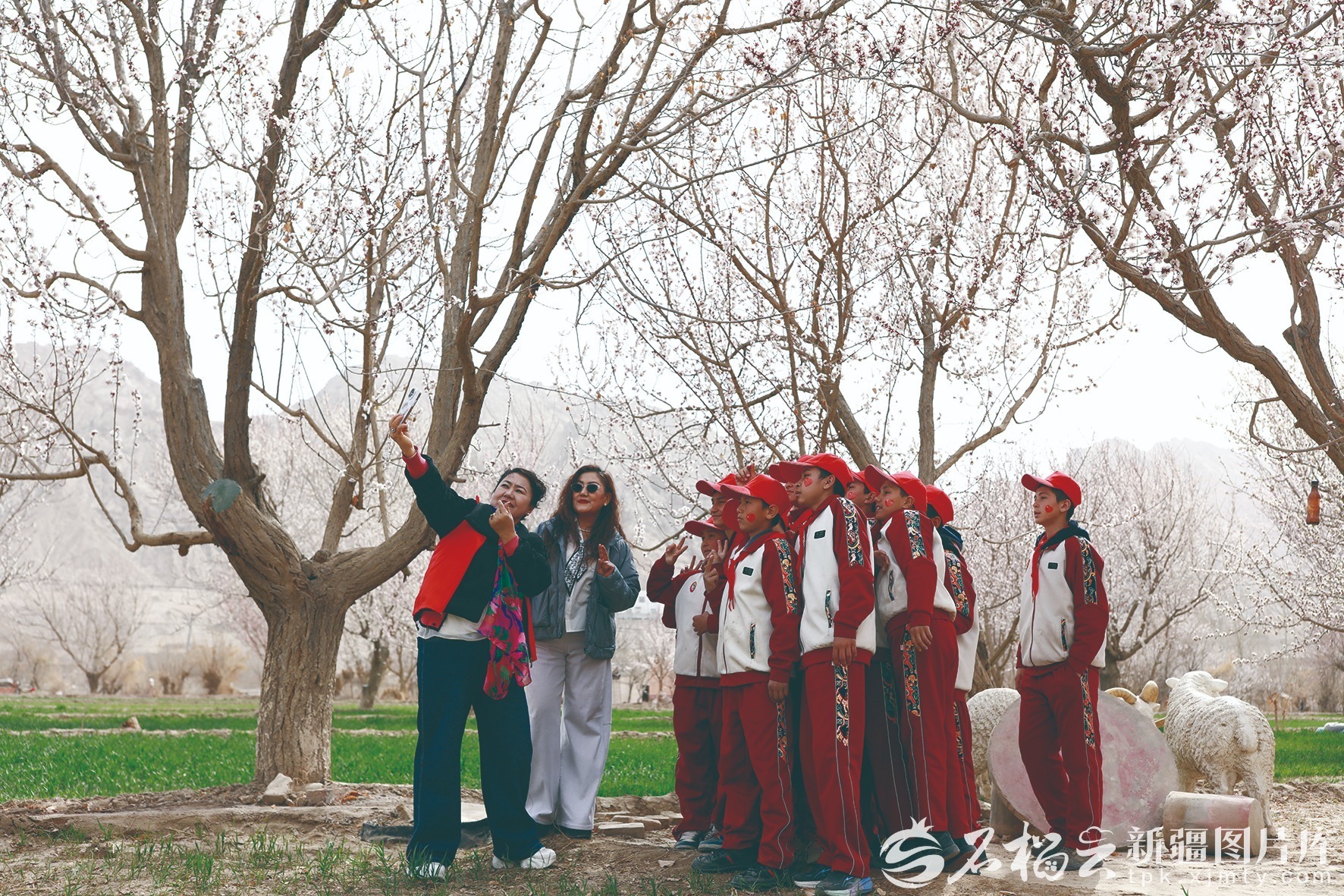 3月19日,洛浦县第五中学师生在洛浦县阿其克乡田间杏树下合影。买买提艾力·艾尼瓦尔 摄