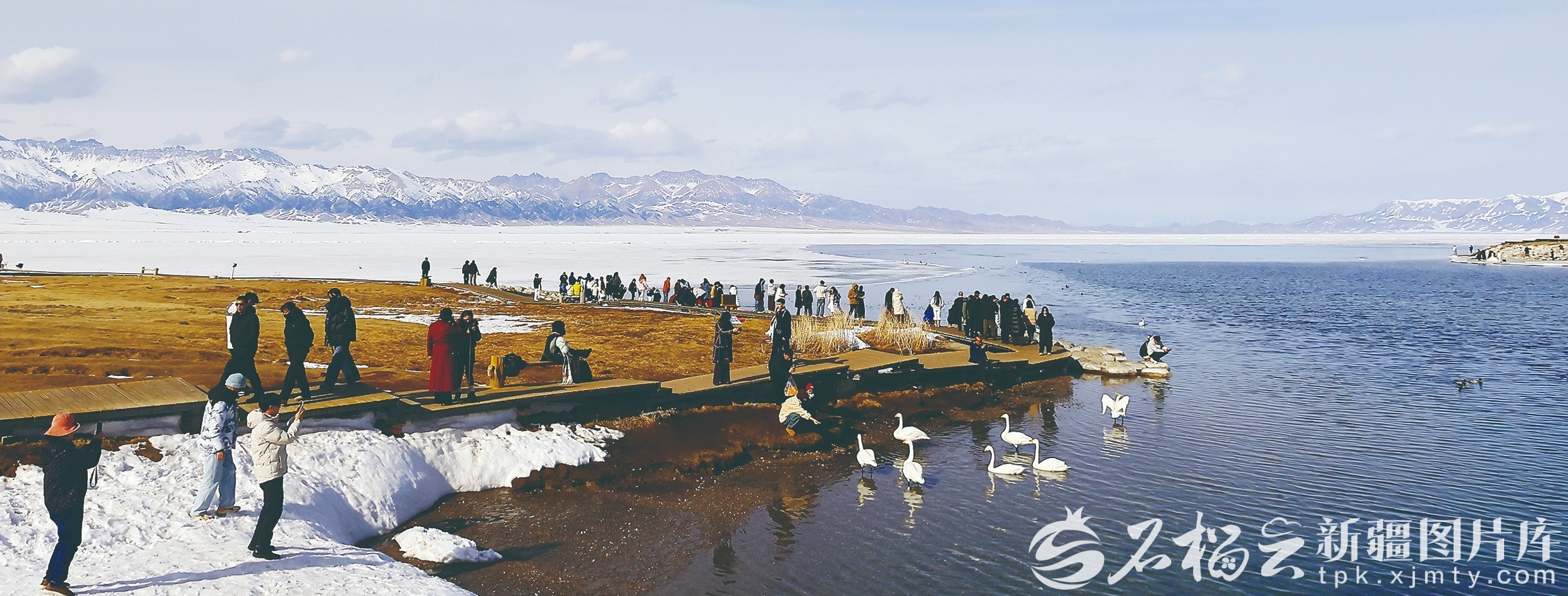 3月15日,游客在赛里木湖景区观赏天鹅。田向东 摄
