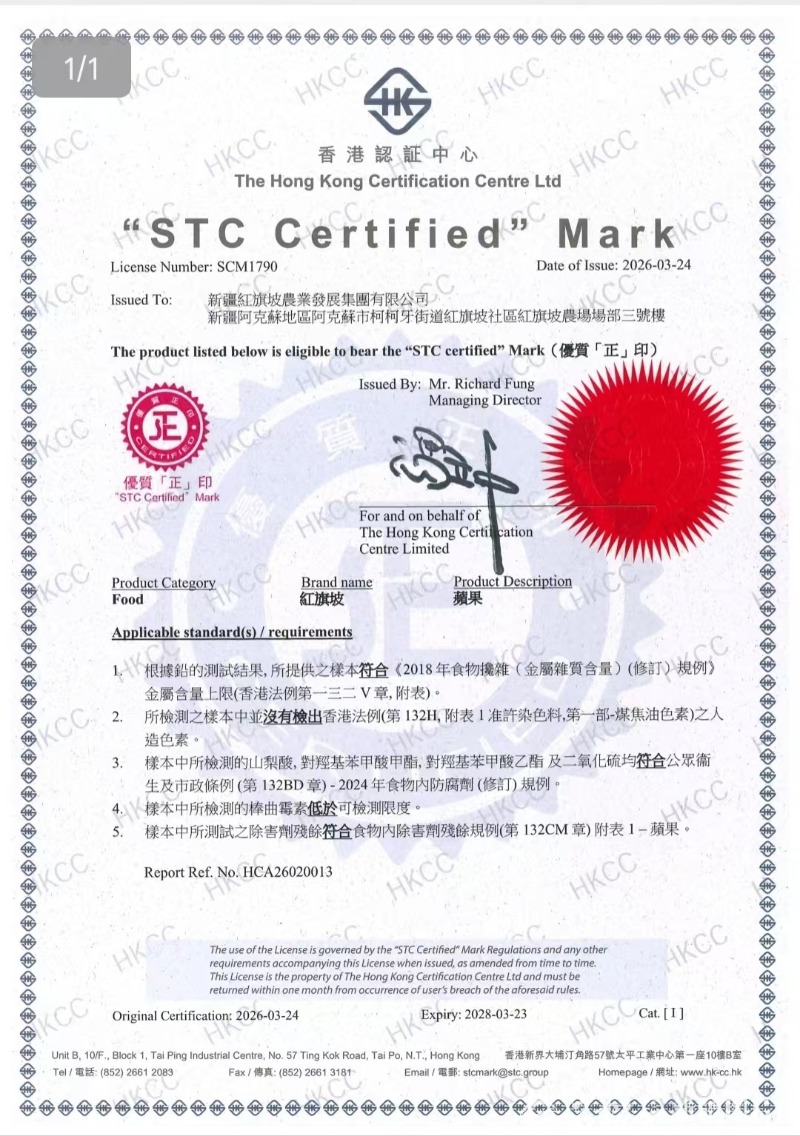 在此次香港优质“正”印认证申请过程中,“红旗坡”苹果接受了香港标准及检定中心(STC)的严苛检测,顺利通过包括重金属、农药残留、微生物等在内的100多项指标测试,符合多项香港食品安全相关法规要求。