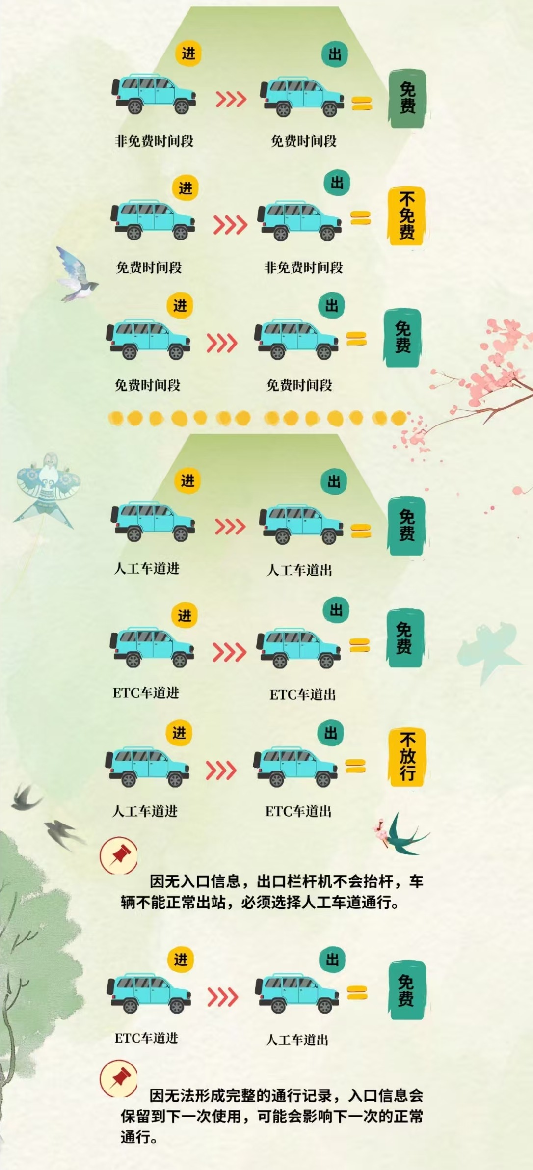 6.免费通行时段结束前,请勿超速赶路,可选择就近收费站先下再上,确保行车安全。