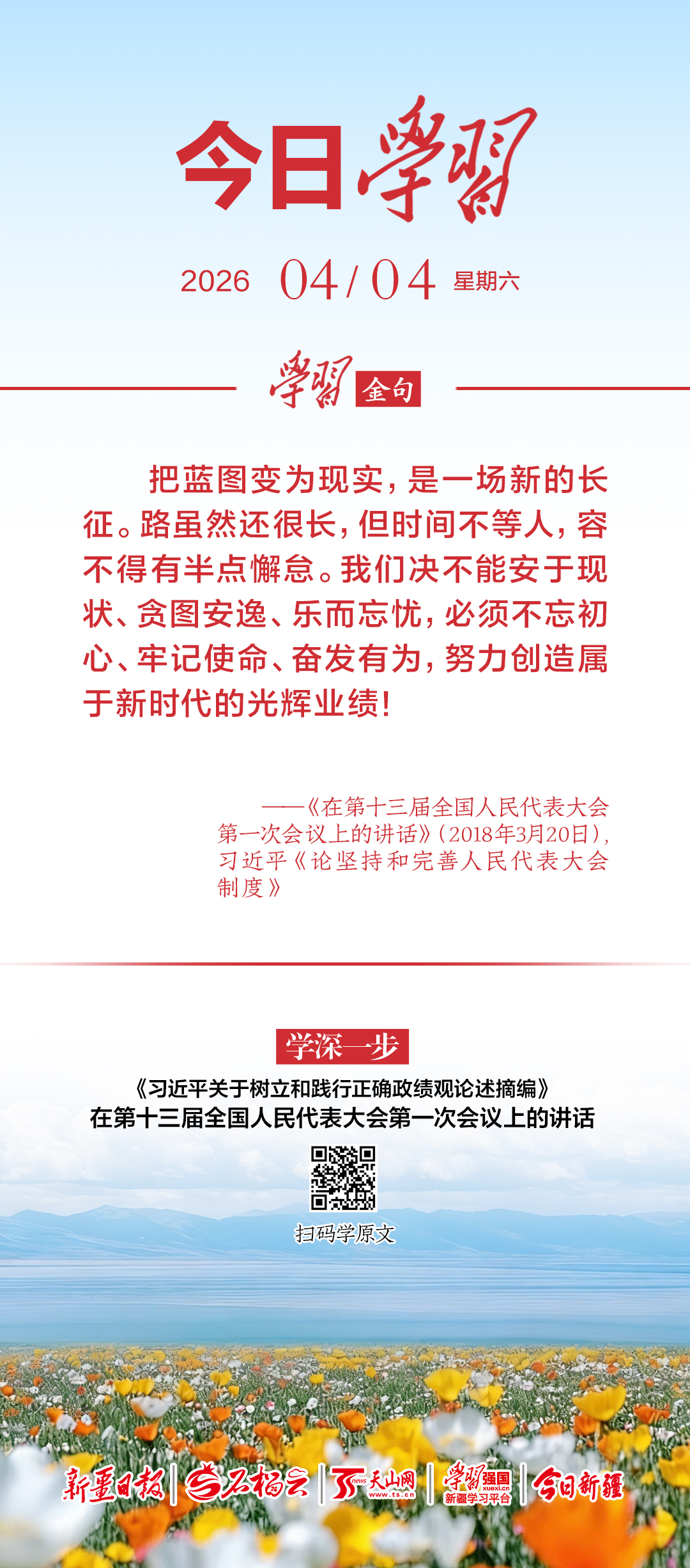 把蓝图变为现实,是一场新的长征。路虽然还很长,但时间不等人,容不得有半点懈怠。我们决不能安于现状、贪图安逸、乐而忘忧,必须不忘初心、牢记使命、奋发有为,努力创造属于新时代的光辉业绩!