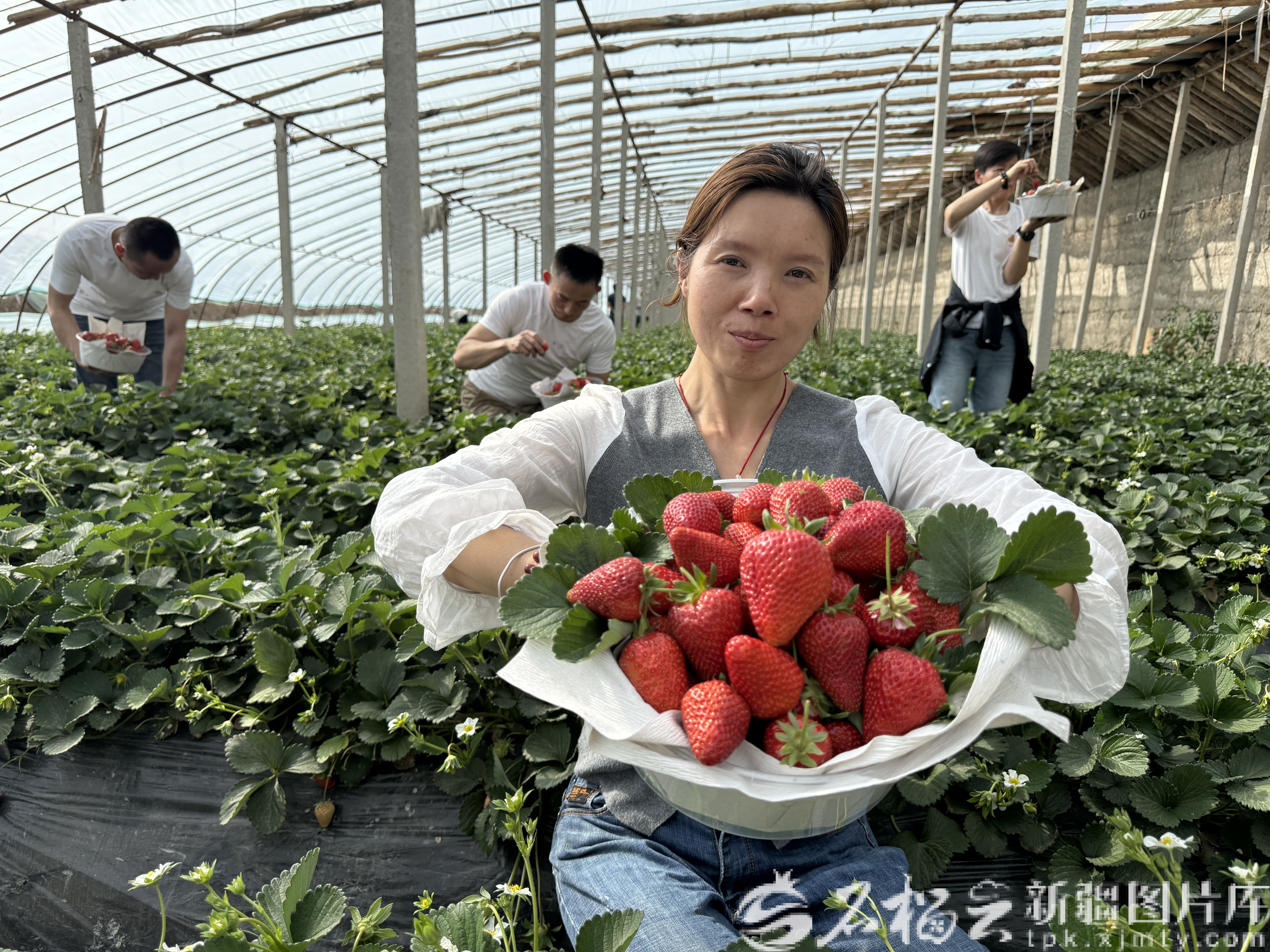 4月5日,和静县巴润哈尔莫敦镇阿日勒村种植户冯萍展示自家种植的草莓。天山网-新疆日报记者 白素君摄