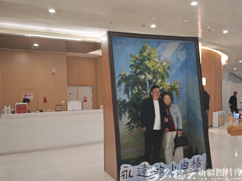 观众在“永远的小白杨”阎维文师生民族声乐音乐会展板前,合影留念。天山网-新疆日报记者 宋海波摄