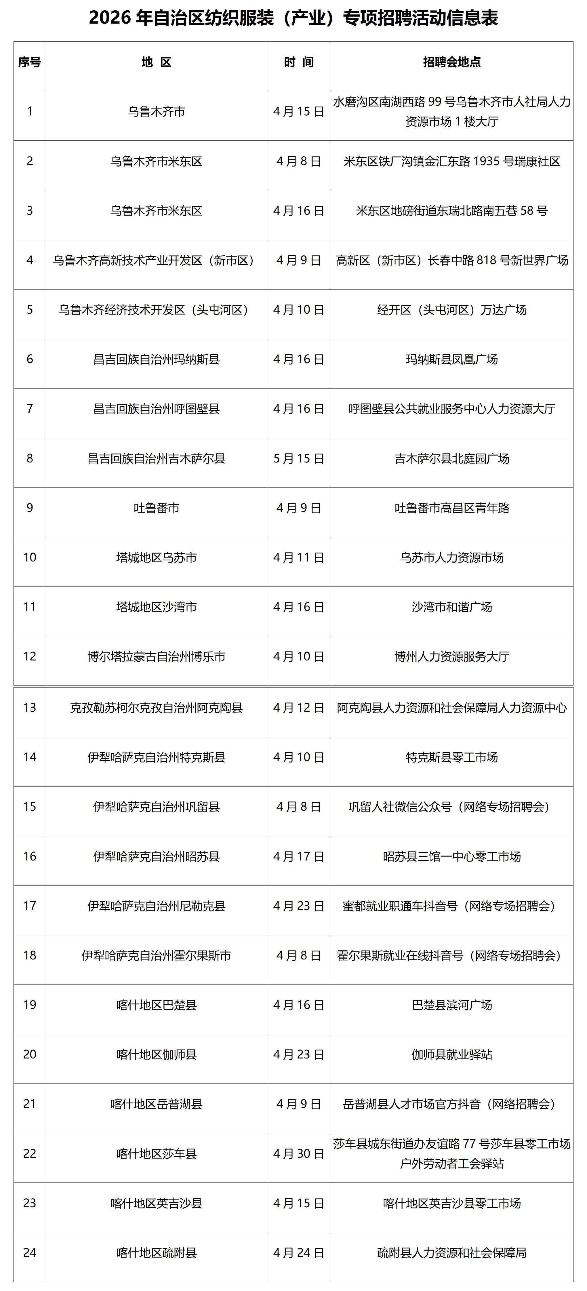 石榴云/新疆日报讯(记者 赵春华报道)4月起,我区将在全疆范围内联动开展2026年自治区纺织服装(产业)专项招聘活动,各地州市专项招聘活动的时间、地点都在这里啦!如果你是正在求职的技术技能人才、高校毕业生、农村劳动力、登记失业人员等,请做好准备,去参加家门口的招聘会吧!