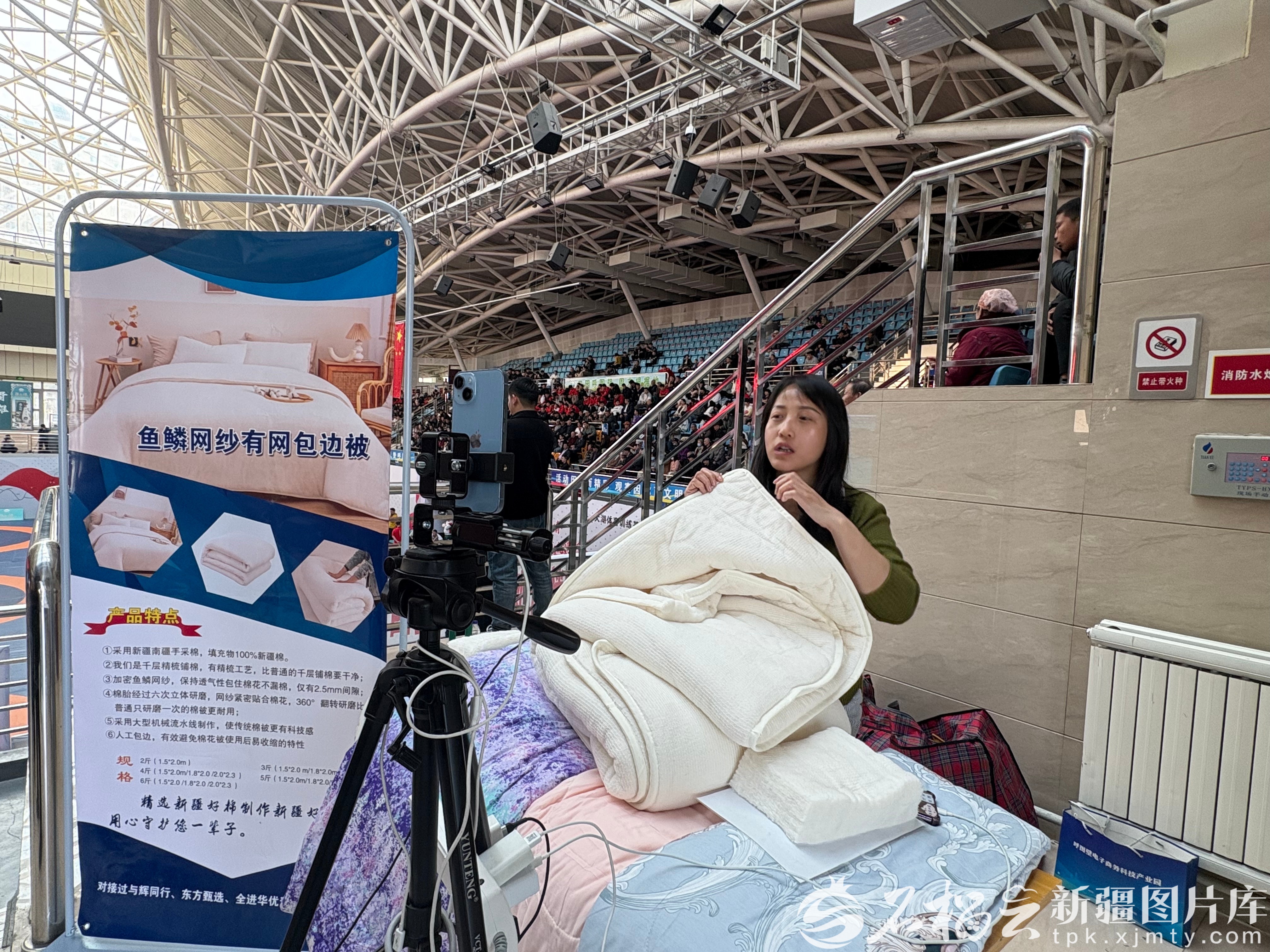 2026年新疆首届“大湖杯”男子自由式摔跤训练营暨对抗赛在呼图壁县举行,当地企业在现场直播带货。石榴云/新疆日报记者 王晶晶摄