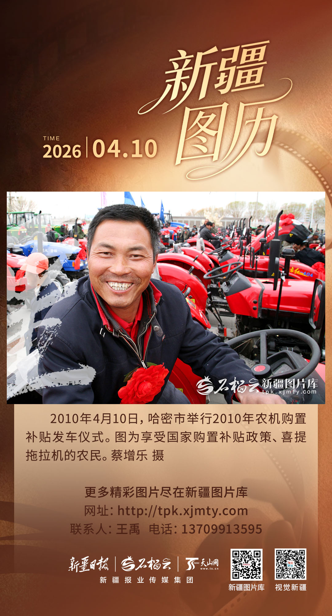 2010年4月,哈密市农机购置补贴发车仪式上,一名农户通过补贴政策购置拖拉机,脸上写满对丰收的期盼。