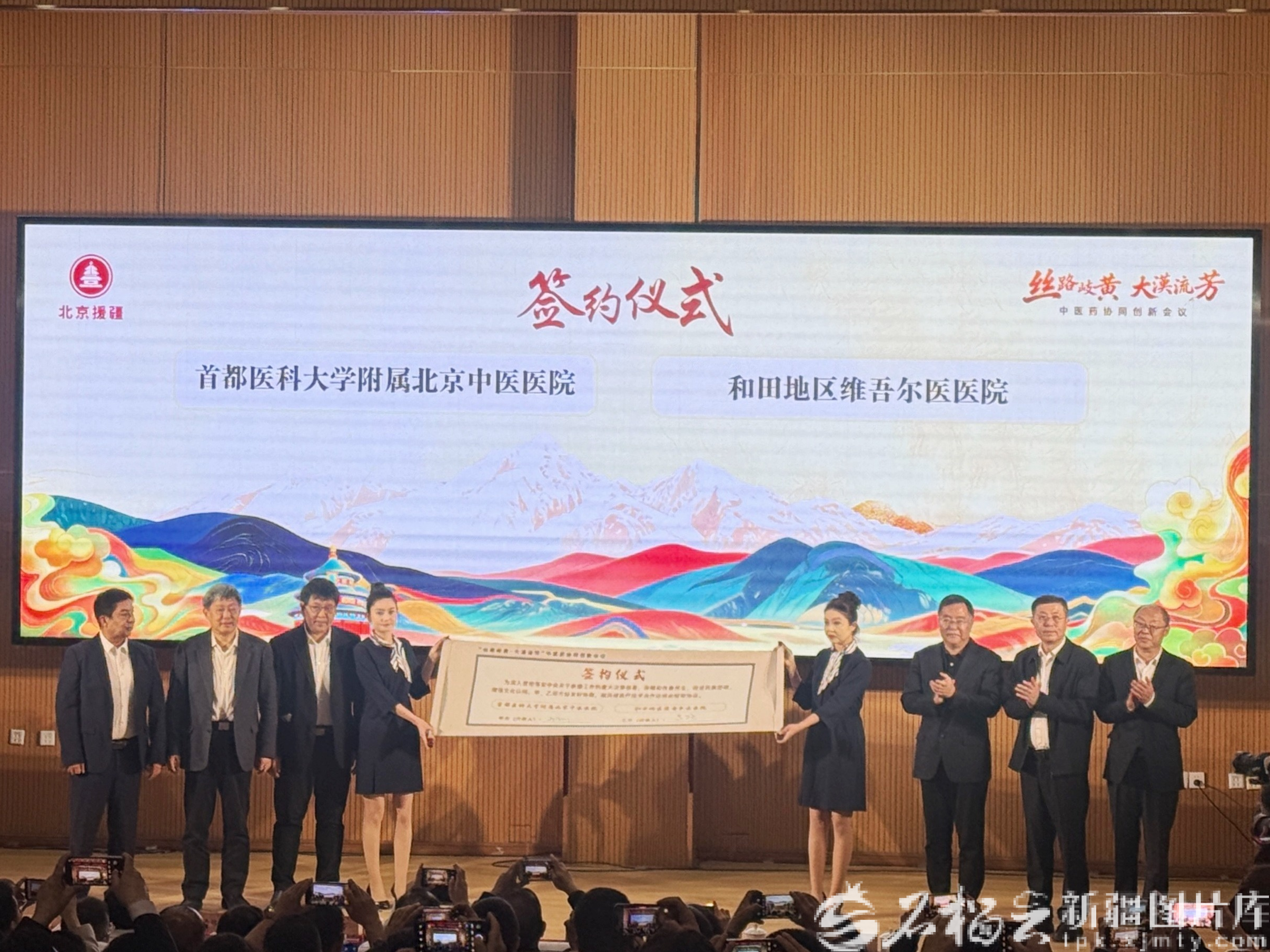 4月11日上午,“丝路岐黄·大漠流芳”中医药协同创新大会在和田开幕。图为首都医科大学附属北京中医医院与和田地区维吾尔医医院签署技术合作协议。天山网-新疆日报记者 拍热扎提·阿不都摄
