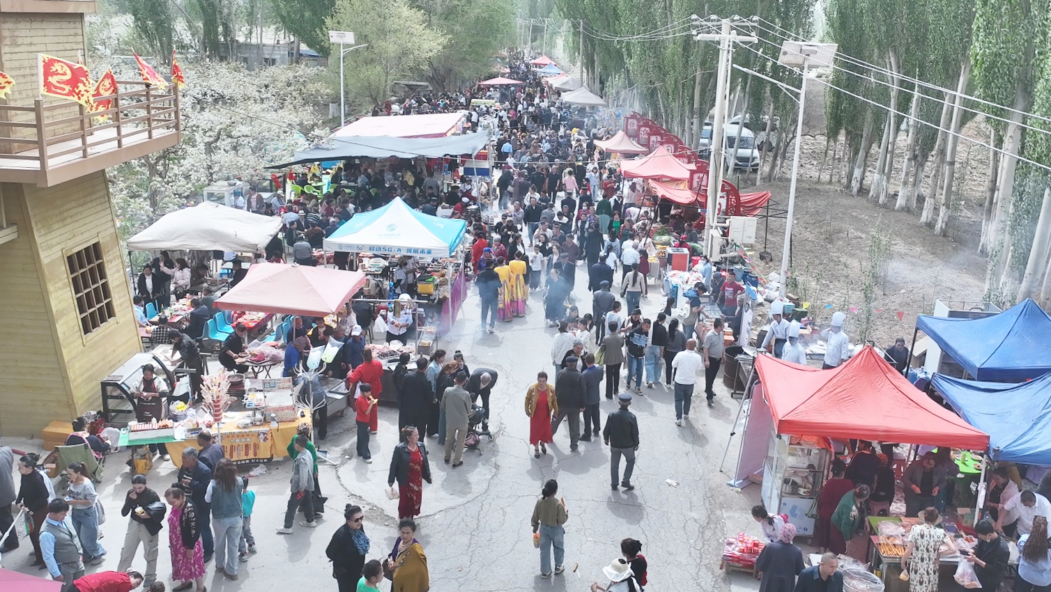步入百年香梨园,洁白梨花缀满枝头,微风拂过,花香四溢。游客们漫步花间拍照打卡,孩童嬉戏打闹,现场热闹非凡。民族歌舞、乐器演奏等节目轮番上演,尽显轮台多元文化风采;特色农产品展销、美食品鉴、非遗展示等配套活动同步开展,让游客深度感受乡土韵味。