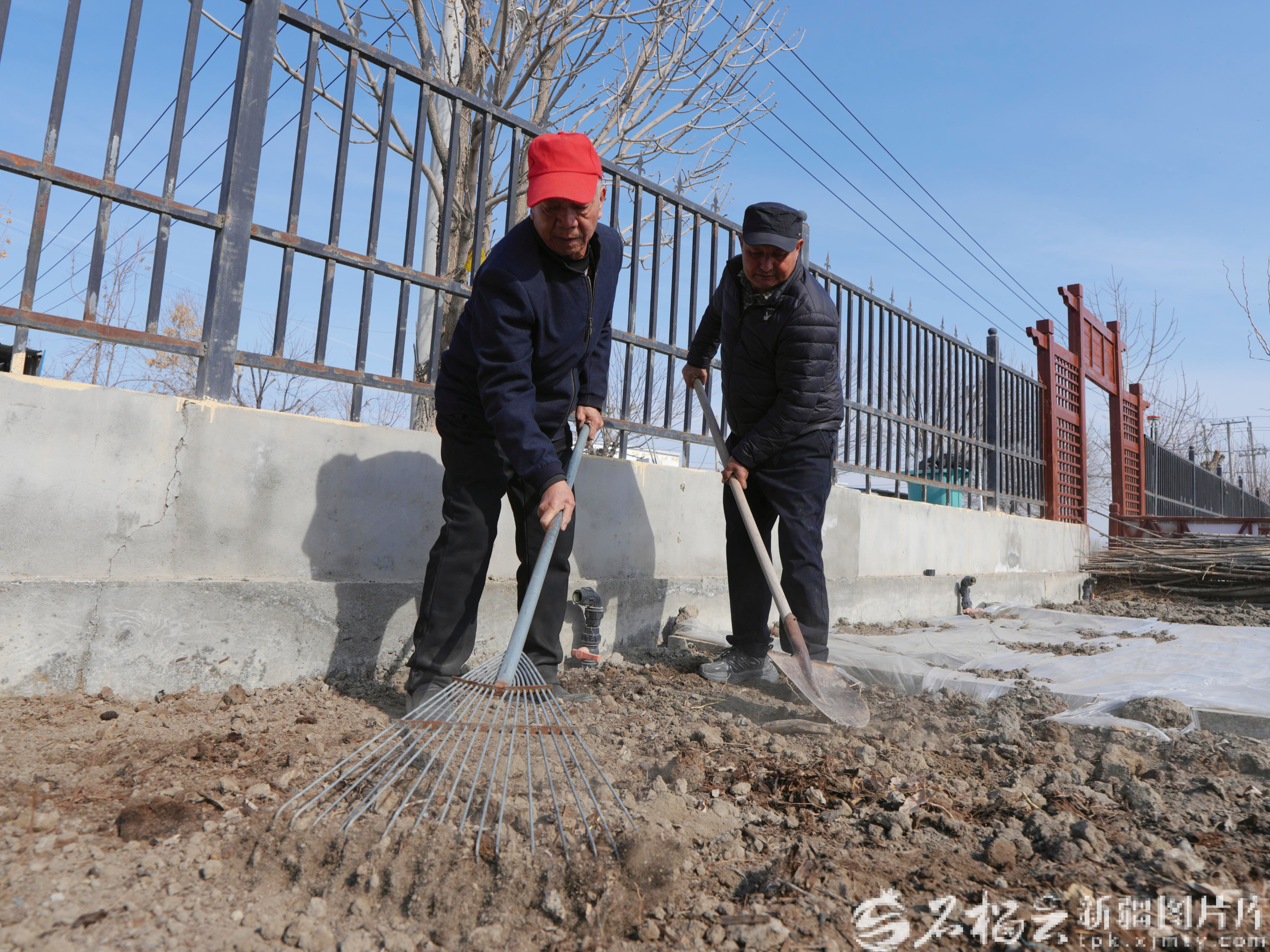 4月12日,乌斯满江(左)和刘自善一起在后院里翻地种菜。田朝阳摄