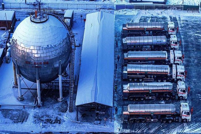 新疆油田公司二氧化碳槽车在一家碳厂列队灌装二氧化碳,准备运到井场注入地层。徐志远 摄(资料图)