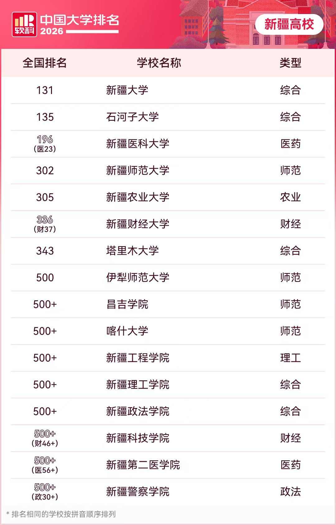 天山网-新疆日报讯(记者赵西娅报道)4月15日,2026软科中国大学排名发布,今年新疆共有16所高校上榜,其中11所高校跻身主榜,即综合性大学排名,5所高校上榜单科性大学排名。