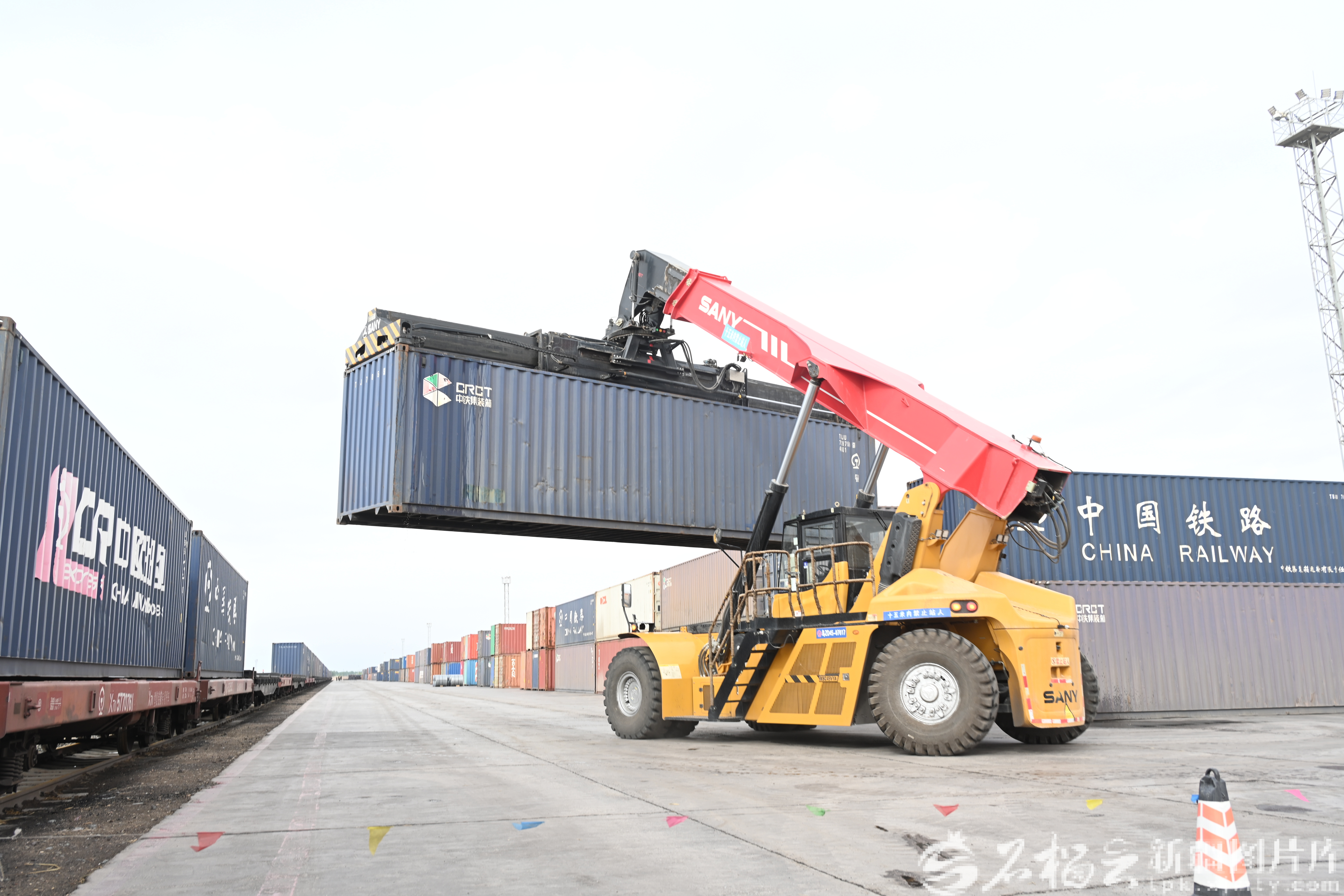 喀什北站,汽车吊正在进行集装箱棉布装车作业。李玥颖 摄